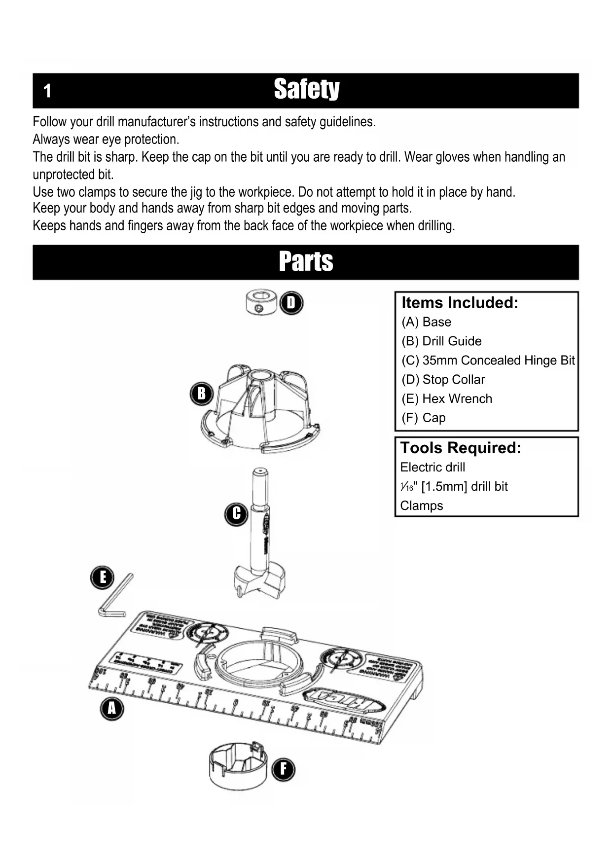 Items Included: (A) Base(B) Drill Guide(C) 35mm Concealed Hinge Bit(D) Stop Collar(E) Hex Wrench(F) Cap Tools Required: Electric drill ⁄16" [1.5mm] drill bitClamps FAssembly
