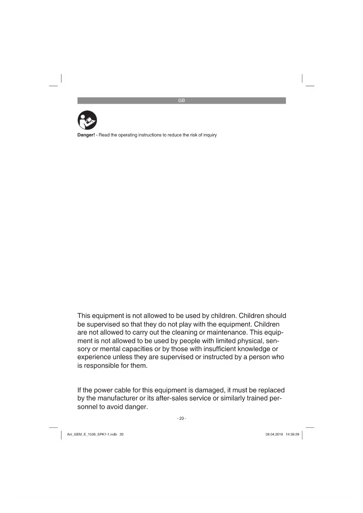 Danger! - Read the operating instructions to reduce the risk of inquiry This equipment is not allowed to be used by children. Children should be supervised so that they do not play with the equipment. Children are not allowed to carry out the cleaning or maintenance. This equip- ment is not allowed to be used by people with limited physical, sen- sory or mental capacities or by those with insuffi cient knowledge or experience unless they are supervised or instructed by a person who is responsible for them. If the power cable for this equipment is damaged, it must be replaced by the manufacturer or its after-sales service or similarly trained per- sonnel to avoid danger. Anl_GEM_E_1536_SPK7-1.indb 20Anl_GEM_E_1536_SPK7-1.indb 20 08.04.2019 14:39:2908.04.2019 14:39:29GB