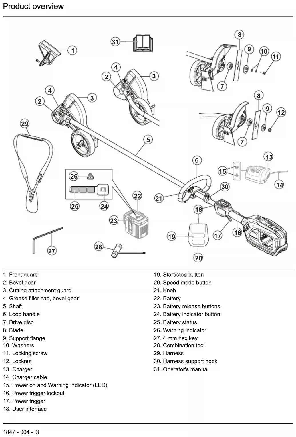 - Make sure that all covers, guards, handles and the cutting equipment are correctly attached and not damaged before you start the product. 14 1847 - 004 -To connect the battery to the product