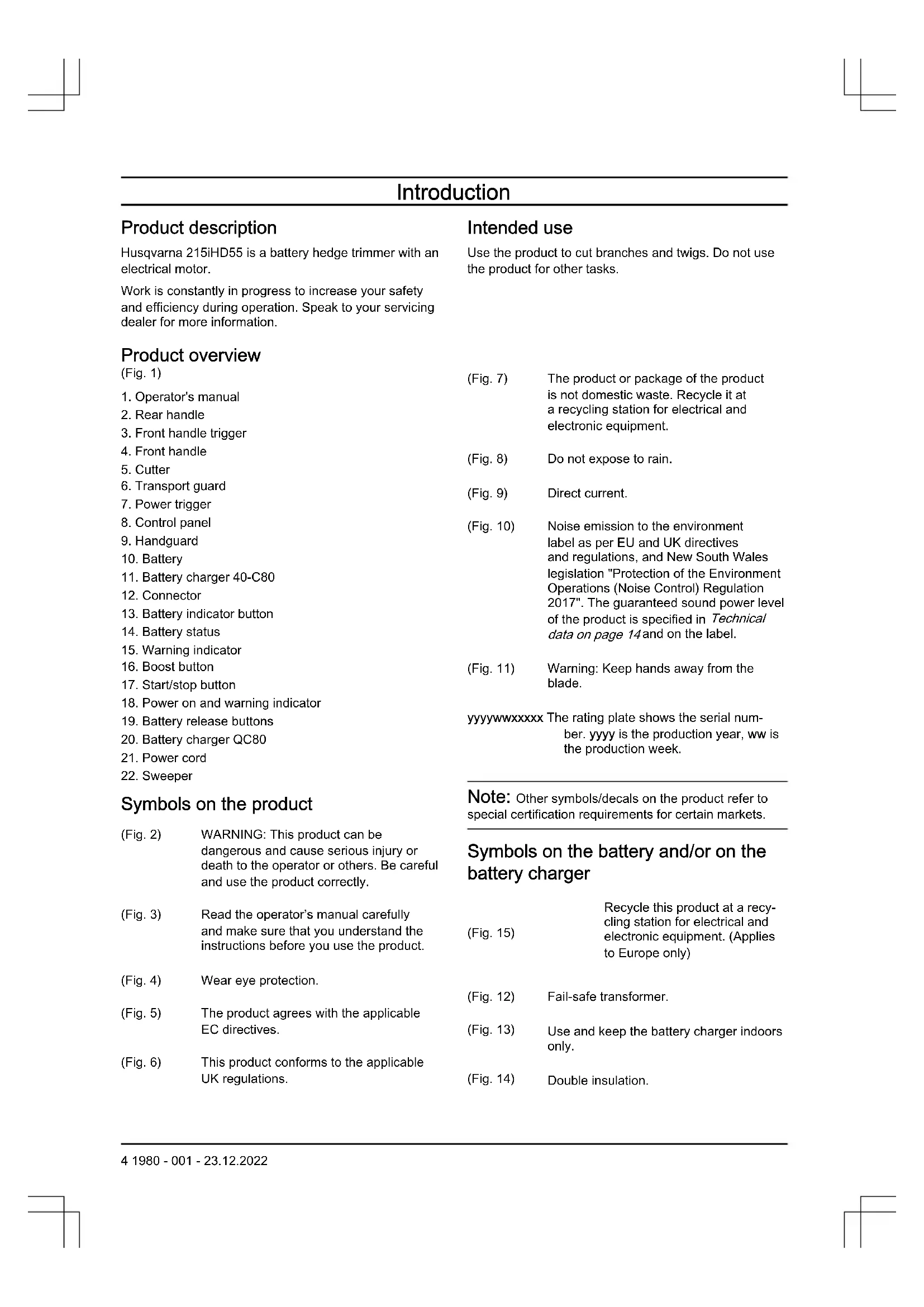 38Introduction Product description Husqvarna 215iHD55 is a battery hedge trimmer with an electrical motor. Work is constantly in progress to increase your safety and efficiency during operation. Speak to your servicing dealer for more information. Intended use Use the product to cut branches and twigs. Do not use the product for other tasks. Product overview (Fig. 1)