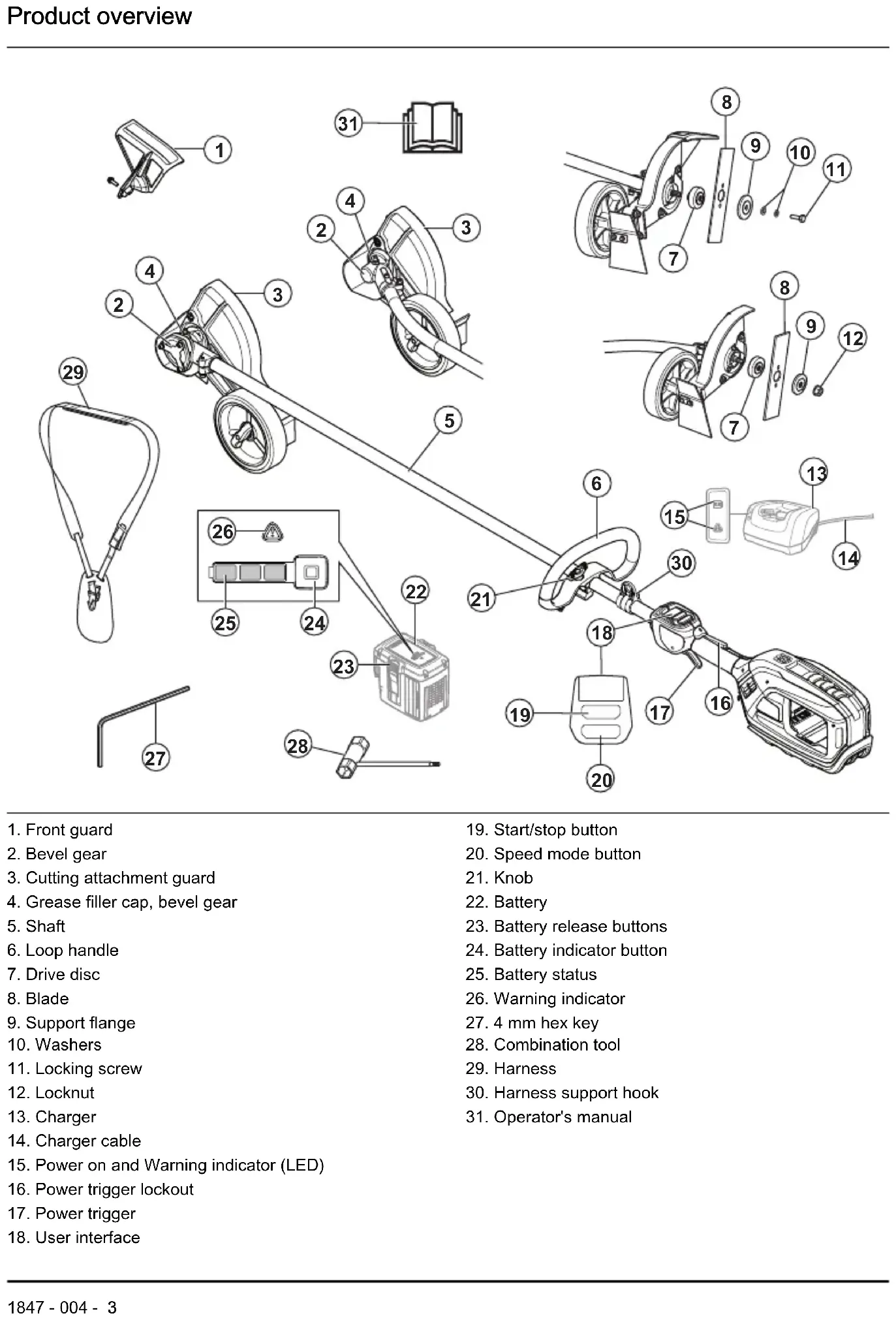 - Make sure that all covers, guards, handles and the cutting equipment are correctly attached and not damaged before you start the product. 14 1847 - 004 -To connect the battery to the product