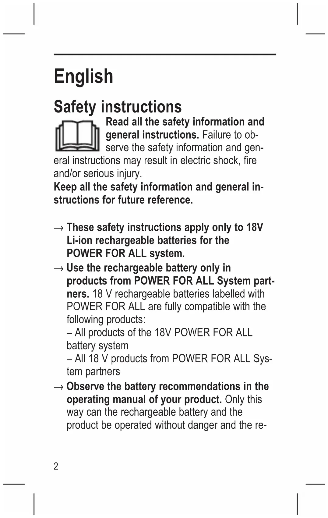 These safety instructions apply only to 18V Li-ion rechargeable batteries for the POWER FOR ALL system.