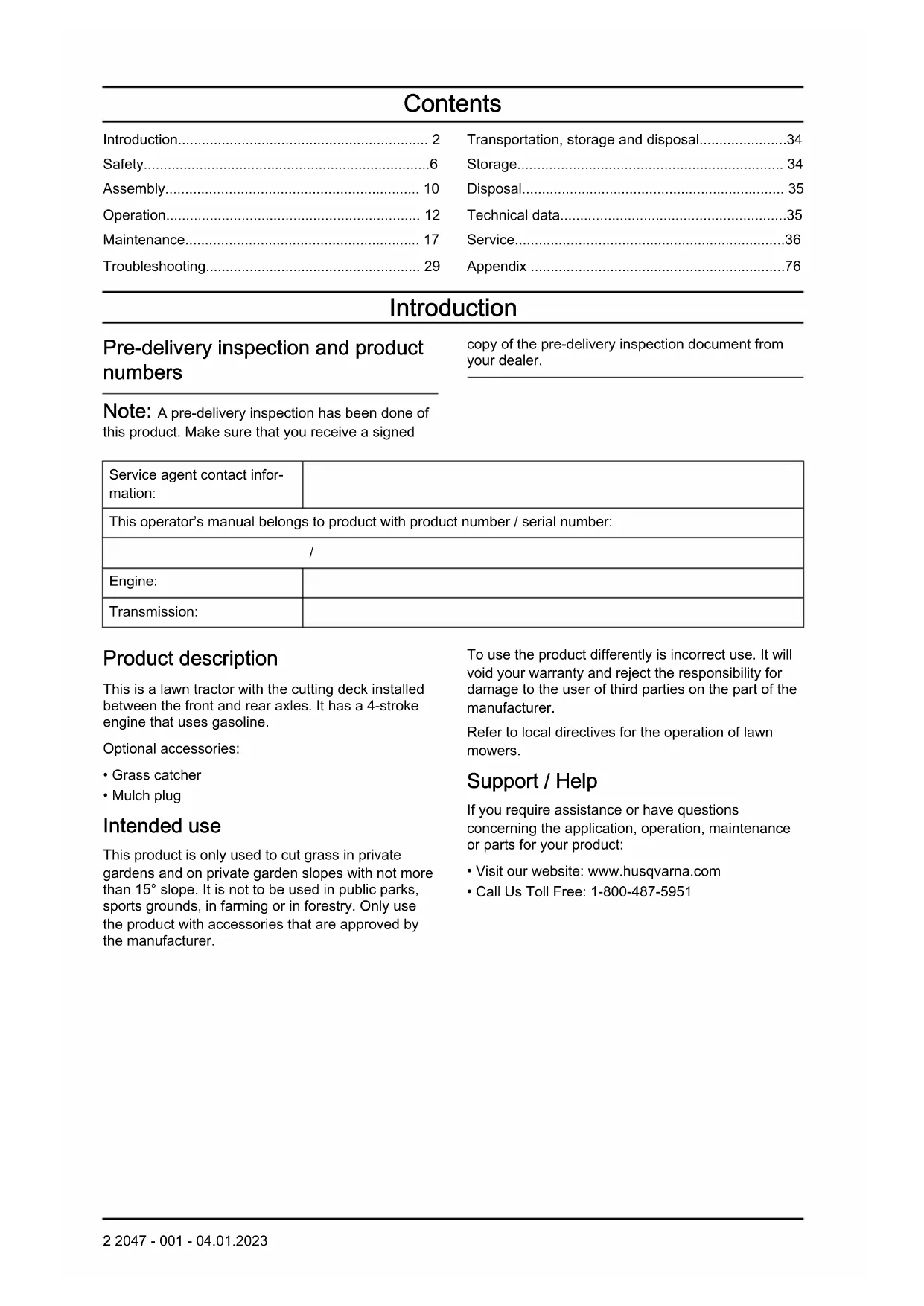 ft (1.5 m) then rearward for 5 ft (1.5 m). Do this procedure 3 times. Troubleshooting Problem Cause Action The engine does not start. There is no fuel in the fuel tank. Fill the fuel tank. The throttle control is not in the correct position. Refer to the start instructions. The spark plug is defective. Replace the spark plug. The air filter is dirty. Clean or replace the air filter. The fuel filter is clogged. Replace the fuel filter. There is water in the fuel. Remove all fuel from the fuel tank and the carburetor. Fill the fuel tank with new fuel and replace the fuel filter. The wires are loose or damaged. Do a check of all wires. The engine valves are not adjus- ted correctly. Speak to an approved service agent. The engine is flooded. Wait 2–3 minutes before you try to start the engine again. The fuel in the fuel tank is bad. Replace the fuel in the fuel tank. 2047 - 001 - 04.01.2023 29Problem Cause Action The starter motor does not turn the engine over. The battery is too weak. Charge the battery. The attachment clutch control is engaged. Disengage the attachment clutch control. The clutch/brake pedal is not pushed down fully. Push down the clutch/brake pedal fully when you start the engine. The connection at the cable con- nectors on the battery terminals is bad. Do a check of the battery connec- tions. The main fuse is defective. Replace the main fuse. The ignition lock is defective. Speak to an approved service agent. The safety connector for clutch/ brake pedal is defective. Speak to an approved service agent. The starter motor or the solenoid is defective. Speak to an approved service agent. The operator presence control (OPC) is defective. Do a check of the wires, switches and connections. If not corrected, speak to an approved service agent. Do not operate product with a defective operator presence con- trol. The engine does not run smoothly. The spark plug is defective. Replace the spark plug. The carburetor is not adjusted cor- rectly. Speak to an approved service agent. The air filter is dirty. Clean or replace the air filter. The check valve on the fuel tank cap is defective. Replace the fuel tank cap. The fuel tank is almost empty. Fill the fuel tank with fuel. There is water in the fuel. Remove all fuel from the fuel tank and the carburetor. Fill the fuel tank with new fuel and replace the fuel filter. The choke is engaged and the en- gine is warm. Disengage the choke. The fuel mix or fuel type is incor- rect. Remove all fuel from the fuel tank and the carburetor. Fill the fuel tank with the correct fuel mix or fuel type. The fuel filter is clogged Replace the fuel filter. The spark plug is defective. Replace the spark plug. There is dirt in the carburetor or fuel line. Clean the carburetor and fuel lines. 30 2047 - 001 - 04.01.2023Problem Cause Action The engine becomes too hot. There is overload in the engine. Decrease the workload. The air intake or the cooling fins on the engine are blocked. Clean the air intake and the cool- ing fins on the engine. The cooling fan is defective. Speak to an approved service agent. The engine oil level is too low. Do a check of the engine oil level. Fill with engine oil if it is necessa- ry. The ignition lock is defective. Speak to an approved service agent. The spark plug is defective. Replace the spark plug. There is loss of power. The product is operated at too high forward or rearward speed when you cut grass. Use slower speed. The throttle control is in the choke position. Put the throttle control in the fast position. There is build-up of grass, leaves or unwanted material under the cutting deck. Clean the cutting deck. The air filter is dirty. Clean or replace the air filter. The engine oil level is too low. Do a check of the engine oil level. Fill with engine oil if it is necessa- ry. The engine oil is dirty. Replace the engine oil. The spark plug is defective. Replace the spark plug. The fuel filter is dirty. Replace the fuel filter. The fuel in the fuel tank is bad. Replace the fuel in the fuel tank. There is water in the fuel. Remove all fuel from the fuel tank and the carburetor. Fill the fuel tank with new fuel and replace the fuel filter. The spark plug wire is loose. Connect and tighten the spark plug wire. The air intake or the cooling fins on the engine are blocked. Clean the air intake and the cool- ing fins on the engine. The muffler is clogged or dam- aged. Clean or replace the muffler. There is loose or damaged wiring. Do a check of all wiring. The engine valves are not adjus- ted correctly. Speak to an approved service agent. There is vibration in the product. The blades are loose. Tighten bolts on the blades. One or more of the blades are damaged or not balanced. Balance the blades or replace the blades. The engine is loose. Tighten the engine bolts. 2047 - 001 - 04.01.2023 31Problem Cause Action The battery does not charge. The main fuse is defective. Replace the main fuse. The battery is defective. Replace the battery. The charging cable is disconnec- ted. Connect the charging cable. The connection at the cable con- nectors on the battery terminals is bad. Do a check of the battery connec- tions. The engine operates when the op- erator gets up from the seat when the cutting deck is engaged. The operator presence control (OPC) is defective. Do a check of the wires, switches and connections. If not corrected, speak to an approved service agent. Do not operate product with a defective operator presence con- trol. The blades cannot rotate. There is blockage in the clutch mechanism. Remove the blockage. The drive belt for the cutting deck is worn or damaged. Replace the drive belt for the cut- ting deck. An idler pulley is frozen. Replace the idler pulley. A blade mandrel is frozen. Replace the blade mandrel. Defective grass discharge. The engine speed is too slow. Put the throttle control in the fast position. The product is operated at too high forward or rearward speed. Use slower speed. The grass is wet. Let 