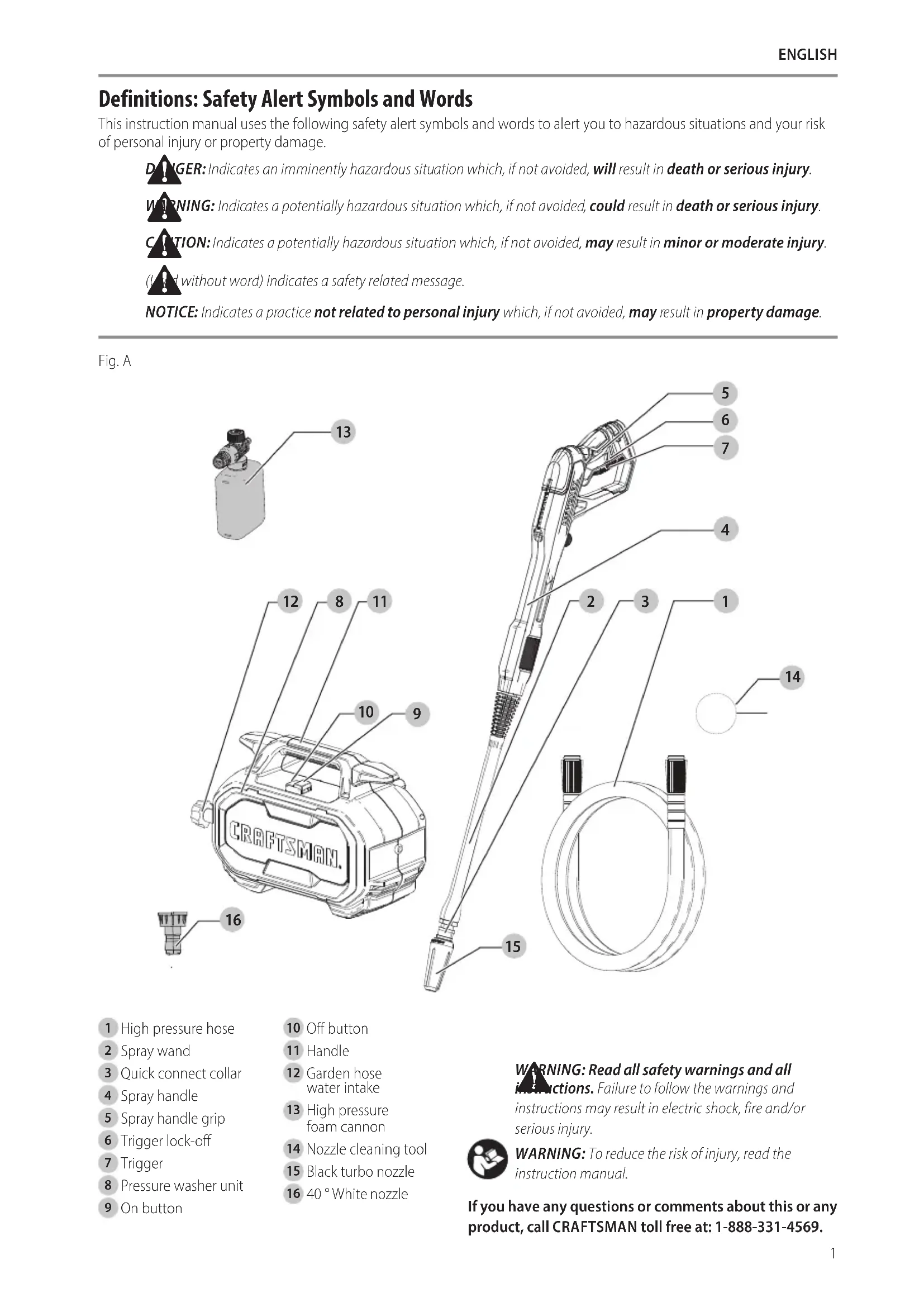 supply off, discharge residual pressure, and engage spray handle lock-off. PROBlEM CAUsE CORRECTiOn Motor does not start. Unit not plugged in. Plug in power cord. ON/OFF switch is in the OFF position. Turn switch to the “ON” position. Wand trigger not being squeezed. Squeeze trigger with switch in “ON” position. GFCI tripped. Press reset button at GFCI on plug end of cord. Check if breaker is tripped in house. Plug cord into a different outlet on its own breaker. Unit does not reach high pressure. Water faucet not fully turned on. Open water valve fully. Water inlet filter clogged. Remove filter and rinse to clean. Nozzle worn. Contact CRAFTSMAN customer service representative at 1-888-331-4569. Pump is sucking air. Check that hoses and fittings are air tight. Turn OFF machine and purge pump by squeezing trigger gun until a steady flow of water emerges from the nozzle. Water supply restricted. Check water hose for kinks, leaks and blockage. Output pressure varies high/low. Not enough inlet water supply. Turn water on full force - check hose for leaks and kinks. Pump is sucking air. Check that hoses and fittings are air tight. Turn OFF machine and purge pump by squeezing trigger gun until a steady flow of water emerges from the nozzle. Water inlet screen clogged. To unclog, rinse OFF with water. Discharge nozzle is obstructed. Blow out or remove debris. No detergent. Detergent container is empty. Add more detergent. Detergent bottle or suction tube not properly connected. Check connections. Detergent is too thick. Use detergent recommended for use in pressure washers only. Filter on detergent suction tube is clogged. Run warm water through filter to remove debris. Damaged or clogged detergent suction tube. Remove obstruction or replace detergent suction tube. Discharge nozzle is obstructed. Blow out or remove debris. Flow control knob closed. Adjust the flow control knob on the top of the high pressure foam cannon. Garden hose connection leaks. Loose fittings. Tighten fittings. Missing/worn rubber washer. Replace washer in hose adapter. Spray wand or extension leaks. Spray wand not properly attached. Insert the spray wand into the wand extension. Push in and turn to lock spray wand into place. Broken O-ring. Contact CRAFTSMAN customer service representative at 1-888-331-4569. Pump is excessively noisy. Pump is sucking air. Check that hoses and fittings are air tight. Turn OFF machine and purge pump by squeezing trigger gun until a steady flow of water emerges from the nozzle. Water leaks from pump. Loose fittings. Check that all fittings are tight. Water seals are damaged or worn. Contact CRAFTSMAN customer service representative at 1-888-331-4569. Oil leaks. Oil seals are damaged or worn. Contact CRAFTSMAN customer service representative at 1-888-331-4569. Motor buzzes but fails to run. Supply voltage below minimum. Verify that only the pressure washer is running on this circuit. System has residual pressure. Turn unit off, squeeze trigger on spray wand to release pressure, then turn unit on. Voltage loss due to extension cord. Do not use extension cord with this unit - plug directly into outlet. Cleaner not used for long periods. Contact CRAFTSMAN customer service representative at 1-888-331-4569.9 EnglishFRANÇAIS