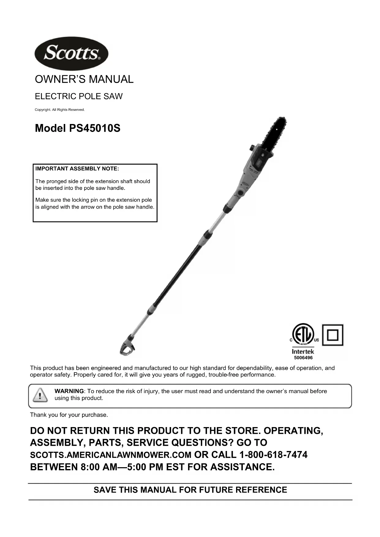 SCOTTS.AMERICANLAWNMOWER.COM OR CALL 1-800-618-7474 BETWEEN 8:00 AM—5:00 PM EST FOR ASSISTANCE. Model PS45010S IMPORTANT ASSEMBLY NOTE: The pronged side of the extension shaft should be inserted into the pole saw handle. Make sure the locking pin on the extension pole is aligned with the arrow on the pole saw handle.GENERAL POWER TOOL SAFETY WARNINGS