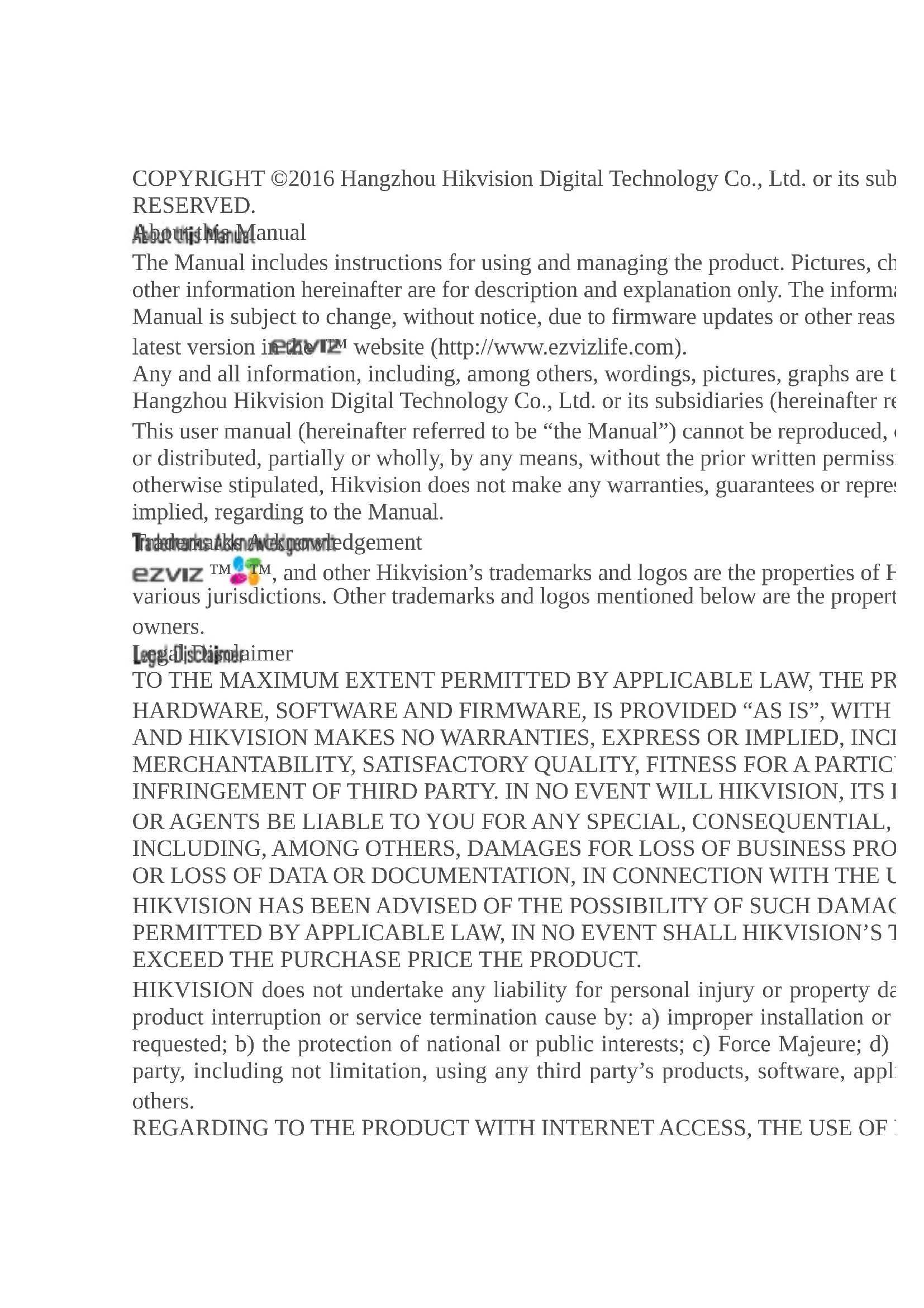 UD01633BCOPYRIGHT ©2016 Hangzhou Hikvision Digital Technology Co., Ltd. or its subsidiaries. ALL RIGHTS RESERVED. About this Manual The Manual includes instructions for using and managing the product. Pictures, charts, images and all other information hereinafter are for description and explanation only. The information contained in the Manual is subject to change, without notice, due to firmware updates or other reasons. Please find the latest version in the ™ website (http://www.ezvizlife.com). Any and all information, including, among others, wordings, pictures, graphs are the properties of Hangzhou Hikvision Digital Technology Co., Ltd. or its subsidiaries (hereinafter referred to be “Hikvision”). This user manual (hereinafter referred to be “the Manual”) cannot be reproduced, changed, translated, or distributed, partially or wholly, by any means, without the prior written permission of Hikvision. Unless otherwise stipulated, Hikvision does not make any warranties, guarantees or representations, express or implied, regarding to the Manual. Trademarks Acknowledgement ™, ™, and other Hikvision’s trademarks and logos are the properties of Hikvision in various jurisdictions. Other trademarks and logos mentioned below are the properties of their respective owners. Legal Disclaimer TO THE MAXIMUM EXTENT PERMITTED BY APPLICABLE LAW, THE PRODUCT DESCRIBED, WITH ITS HARDWARE, SOFTWARE AND FIRMWARE, IS PROVIDED “AS IS”, WITH ALL FAULTS AND ERRORS, AND HIKVISION MAKES NO WARRANTIES, EXPRESS OR IMPLIED, INCLUDING WITHOUT LIMITATION, MERCHANTABILITY, SATISFACTORY QUALITY, FITNESS FOR A PARTICULAR PURPOSE, AND NON- INFRINGEMENT OF THIRD PARTY. IN NO EVENT WILL HIKVISION, ITS DIRECTORS, OFFICERS, EMPLOYEES, OR AGENTS BE LIABLE TO YOU FOR ANY SPECIAL, CONSEQUENTIAL, INCIDENTAL, OR INDIRECT DAMAGES, INCLUDING, AMONG OTHERS, DAMAGES FOR LOSS OF BUSINESS PROFITS, BUSINESS INTERRUPTION, OR LOSS OF DATA OR DOCUMENTATION, IN CONNECTION WITH THE USE OF THIS PRODUCT, EVEN IF HIKVISION HAS BEEN ADVISED OF THE POSSIBILITY OF SUCH DAMAGES. TO THE MAXIMUM EXTENT PERMITTED BY APPLICABLE LAW, IN NO EVENT SHALL HIKVISION’S TOTAL LIABILITY FOR ALL DAMAGES EXCEED THE PURCHASE PRICE THE PRODUCT. HIKVISION does not undertake any liability for personal injury or property damage, as the result of product interruption or service termination cause by: a) improper installation or usage other than as requested; b) the protection of national or public interests; c) Force Majeure; d) yourself or the third party, including not limitation, using any third party’s products, software, applications, and among others. REGARDING TO THE PRODUCT WITH INTERNET ACCESS, THE USE OF PRODUCT SHALL BE WHOLLY ATYOUR OWN RISKS. HIKVISION SHALL NOT TAKE ANY RESPONSIBILITES FOR ABNORMAL OPERATION, PRIVACY LEAKAGE OR OTHER DAMAGES RESULTING FROM CYBER ATTACK, HACKER ATTACK, VIRUS INSPECTION, OR OTHER INTERNET SECURITY RISKS; HOWEVER, HIKVISION WILL PROVIDE TIMELY TECHNICAL SUPPORT IF REQUIRED. SURVEILLANCE LAWS VARY BY JURISDICTION. PLEASE CHECK ALL RELEVANT LAWS IN YOUR JURISDICTION BEFORE USING THIS PRODUCT IN ORDER TO ENSURE THAT YOUR USE CONFORMS TO THE APPLICABLE LAW. YOU FUTHER AGREE THAT THIS PRODUCT IS ONLY FOR CIVIL USE, AND HIKVISION SHALL NOT BE LIABLE IN THE EVENT THAT THIS PRODUCT IS USED WITH ILLEGITIMATE PURPOSES, SUCH AS THIRD PARTY RIGHTS INFRINGEMENT, MEDICAL TREATMENT, SAFETY EQUIPMENT OR OTHER SITUATIONS WHERE THE PRODUCT FAILURE COULD LEAD TO DEATH OR PERSONAL INJURY, OR WEAPON OF MASS DESTRUCTION, CHEMINCAL AND BIOLOGICAL WEAPON, NUCLEAR EXPLOSION, AND ANY UNSAFE NUCLEAR ENERGY USES OR ANTI-HUMANITY USAGES. YOU SHOULD UNDERTAKE ALL RESPONSIBILITIES FOR LOSSES OR DAMAGES RESULTING FROM THE ABOVE USAGES WHATSOEVER. IN THE EVENT OF ANY CONFLICTS BETWEEN THE ABOVE AND THE APPLICABLE LAW, THE LATER PREVAILS. Regulatory Information FCC Information Please take attention that changes or modification not expressly approved by the party responsible for compliance could void the user’s authority to operate the equipment. FCC compliance: This equipment has been tested and found to comply with the limits for a Class B digital device, pursuant to part 15 of the FCC Rules. These limits are designed to provide reasonable protection against harmful interference in a residential installation. This equipment generates, uses and can radiate radio frequency energy and, if not installed and used in accordance with the instructions, may cause harmful interference to radio communications. However, there is no guarantee that interference will not occur in a particular installation. If this equipment does cause harmful interference to radio or television reception, which can be determined by turning the equipment off and on, the user is encouraged to try to correct the interference by one or more of the following measures: —Reorient or relocate the receiving antenna. —Increase the separation between the equipment and receiver. —Connect the equipment into an outlet on a circuit different from that to which the receiver is connected.—Consult the dealer or an experienced radio/TV technician for help FCC Conditions This device complies with part 15 of the FCC Rules. Operation is subject to the following two conditions: