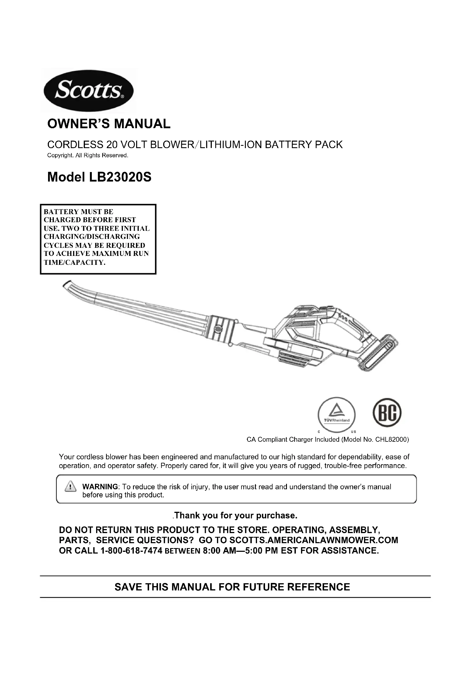 LB23020S Battery Pack ChargerCALL US FIRST !! Call us first with questions about operating or maintaining your cordless blower at 1.800.618.7474 between 8:00 a.m. – 5:00 p.m. Eastern Standard Time, or get assistance on scotts.americanlawnmower.com
