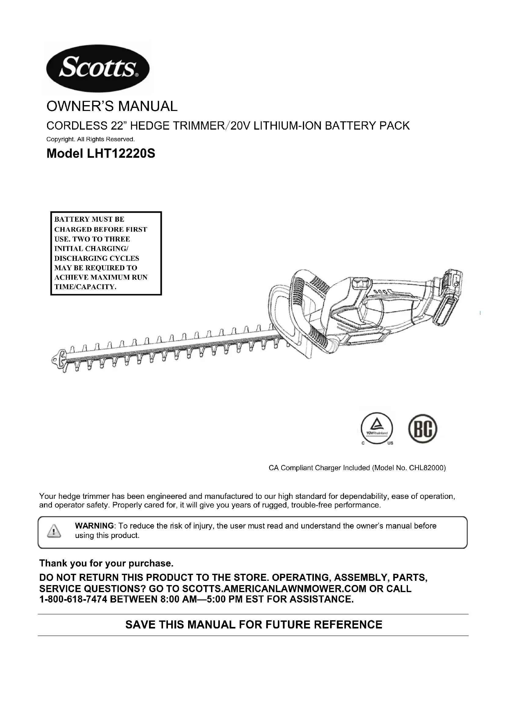 LHT12220SCALL US FIRST !! Call us first with questions about operating or maintaining your hedge trimmer at 1.800.618.7474 between 8:00 a.m. – 5:00 p.m. Eastern Standard Time, or get assistance on scotts.americanlawnmower.com.