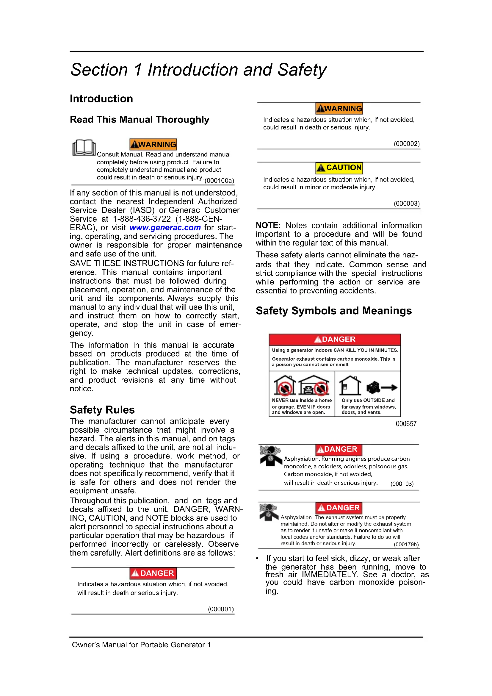 Introduction Read This Manual Thoroughly If any section of this manual is not understood, contact the nearest Independent Authorized Service Dealer (IASD) or Generac Customer Service at 1-888-436-3722 (1-888-GEN- ERAC), or visit www.generac.com for start- ing, operating, and servicing procedures. The owner is responsible for proper maintenance and safe use of the unit. SAVE THESE INSTRUCTIONS for future ref- erence. This manual contains important instructions that must be followed during placement, operation, and maintenance of the unit and its components. Always supply this manual to any individual that will use this unit, and instruct them on how to correctly start, operate, and stop the unit in case of emer- gency. The information in this manual is accurate based on products produced at the time of publication. The manufacturer reserves the right to make technical updates, corrections, and product revisions at any time without notice. Safety Rules The manufacturer cannot anticipate every possible circumstance that might involve a hazard. The alerts in this manual, and on tags and decals affixed to the unit, are not all inclu- sive. If using a procedure, work method, or operating technique that the manufacturer does not specifically recommend, verify that it is safe for others and does not render the equipment unsafe. Throughout this publication, and on tags and decals affixed to the unit, DANGER, WARN- ING, CAUTION, and NOTE blocks are used to alert personnel to special instructions about a particular operation that may be hazardous if performed incorrectly or carelessly. Observe them carefully. Alert definitions are as follows: NOTE: Notes contain additional information important to a procedure and will be found within the regular text of this manual. These safety alerts cannot eliminate the haz- ards that they indicate. Common sense and strict compliance with the special instructions while performing the action or service are essential to preventing accidents. Safety Symbols and Meanings