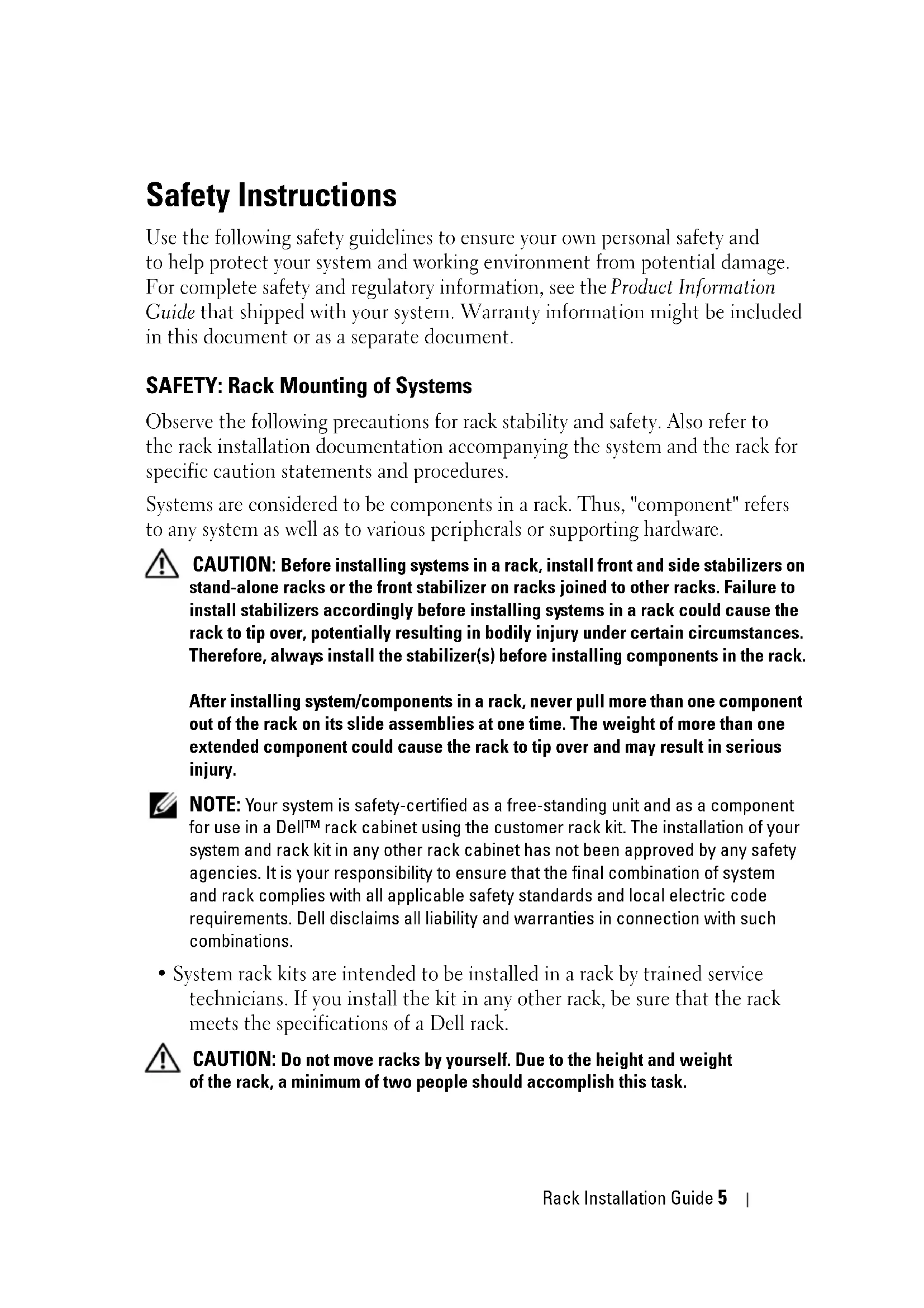 Index . . . . . . . . . . . . . . . . . . . . . . . . . . . . . . . 254 ContentsRack Installation Guide 5 Safety Instructions Use the following safety guidelines to ensure your own personal safety and to help protect your system and working environment from potential damage. For complete safety and regulatory information, see the Product Information Guide that shipped with your system. Warranty information might be included in this document or as a separate document. SAFETY: Rack Mounting of Systems Observe the following precautions for rack stability and safety. Also refer to the rack installation documentation accompanying the system and the rack for specific caution statements and procedures. Systems are considered to be components in a rack. Thus, "component" refers to any system as well as to various peripherals or supporting hardware. CAUTION: Before installing systems in a rack, install front and side stabilizers on stand-alone racks or the front stabilizer on racks joined to other racks. Failure to install stabilizers accordingly before installing systems in a rack could cause the rack to tip over, potentially resulting in bodily injury under certain circumstances. Therefore, always install the stabilizer(s) before installing components in the rack. After installing system/components in a rack, never pull more than one component out of the rack on its slide assemblies at one time. The weight of more than one extended component could cause the rack to tip over and may result in serious injury. NOTE: Your system is safety-certified as a free-standing unit and as a component for use in a Dell™ rack cabinet using the customer rack kit. The installation of your system and rack kit in any other rack cabinet has not been approved by any safety agencies. It is your responsibility to ensure that the final combination of system and rack complies with all applicable safety standards and local electric code requirements. Dell disclaims all liability and warranties in connection with such combinations.