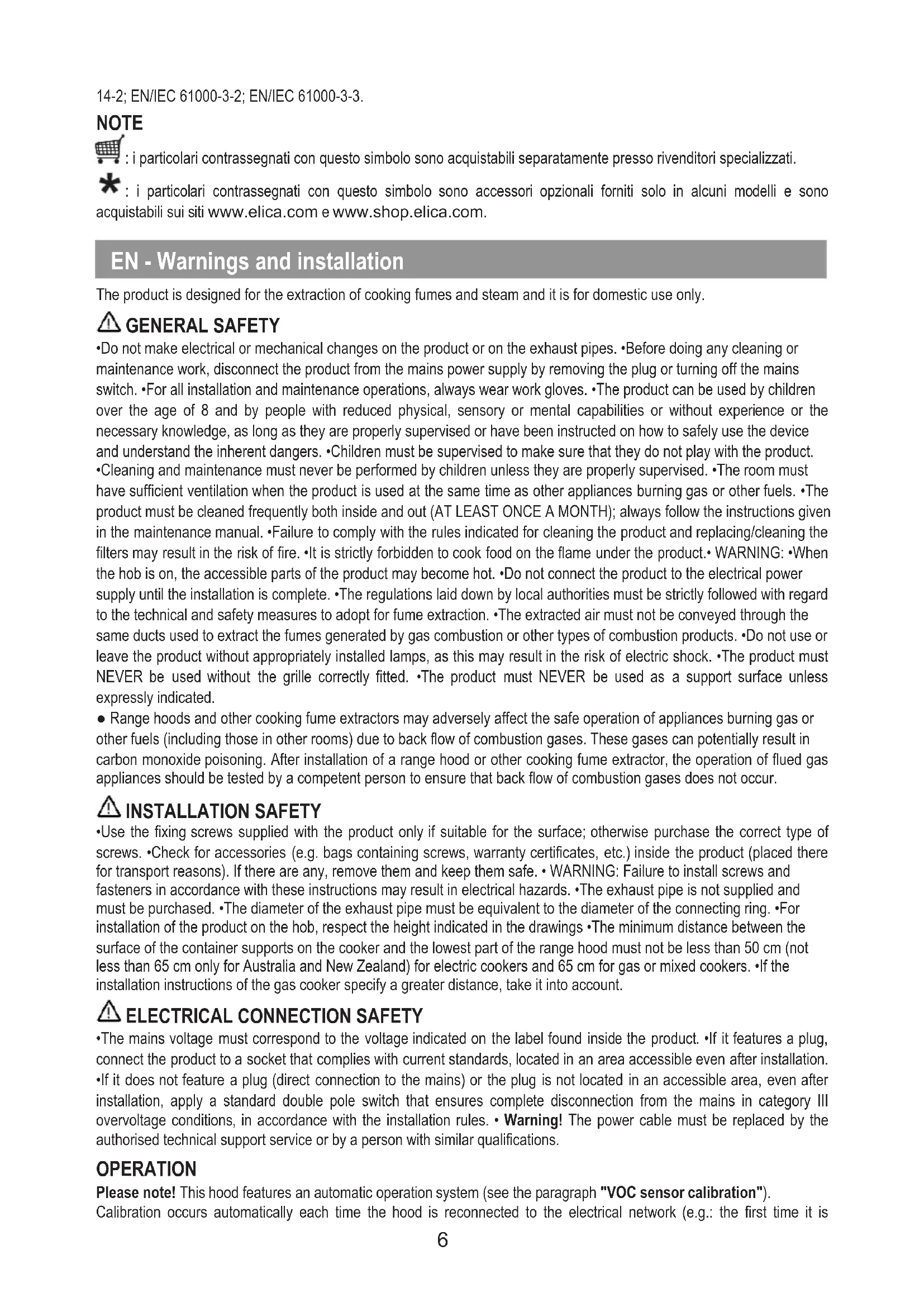 - Lighting system : The lighting system cannot be replaced by the user, contact Customer Service in case of malfunc- tion. END-OF-LIFE DISPOSAL This device is marked in compliance with the European Directive 2012/19/EC - UK SI 2013 No.3113, Waste Electrical and Electronic Equipment (WEEE). Make sure that this product is disposed of correctly. The user helps prevent potential negative consequences for the environment and for health. The symbol on the product or accompanying documentation indicates that this product should not be treated as household waste but should be handed over at a suitable collection point for the recycling of electrical and electronic equipment. Dispose of it in accordance with local regulations for waste disposal. For further information about the treatment, recovery and recycling of this product, please contact your local authority, the collection service for household waste or the shop from where the product was purchased. REGULATIONS Equipment designed, tested and manufactured in compliance with safety regulations: EN/IEC 60335-1; EN/IEC 60335-2- 31, EN/IEC 62233. Performance: EN/IEC 61591; ISO 5167-1; ISO 5167-3; ISO 5168; EN/IEC 60704-1; EN/IEC 60704-2-13;EN/IEC 60704-3; ISO 3741; EN 50564; IEC 62301. EMC: EN 55014-1; CISPR 14-1; EN 55014-2; CISPR 14-2; EN/IEC 61000-3-2; EN/IEC 61000-3-3. 8NOTES : the parts marked with this symbol can be purchased separately from specialised dealers. : the parts marked with this symbol are optional accessories supplied only with some models and can be purchased from the websites www.elica.com and www.shop.elica.com. DE - Warnungen und Installation Das Produkt ist für die Absaugung von Kochdämpfen konzipiert und nur für den Hausgebrauch bestimmt. ALLGEMEINE SICHERHEIT