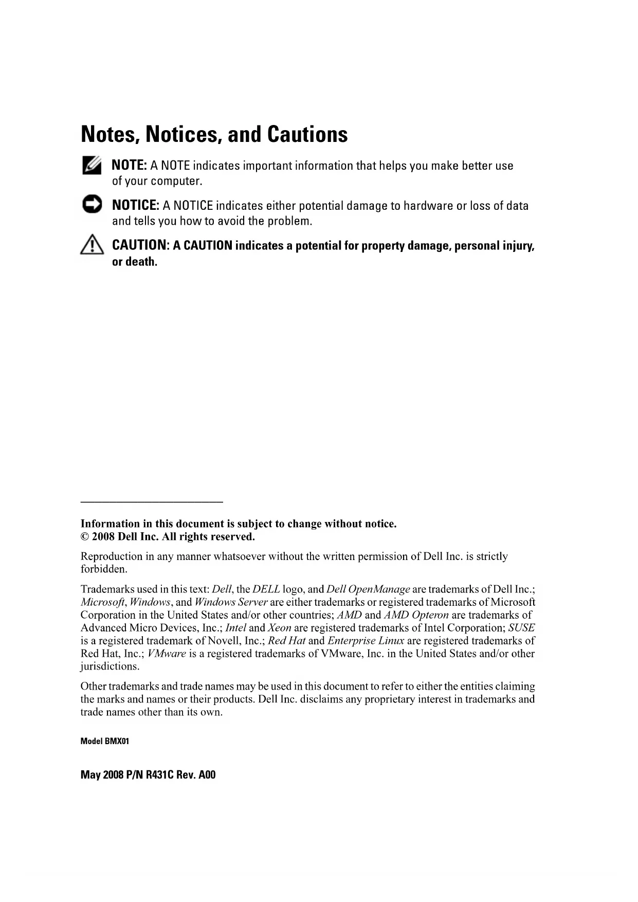 Information in this document is subject to change without notice. © 2008 Dell Inc. All rights reserved. Reproduction in any manner whatsoever without the written permission of Dell Inc. is strictly forbidden. Trademarks used in this text: Dell, the DELL logo, and Dell OpenManage are trademarks of Dell Inc.; Microsoft, Windows, and Windows Server are either trademarks or registered trademarks of Microsoft Corporation in the United States and/or other countries; AMD and AMD Opteron are trademarks of Advanced Micro Devices, Inc.; Intel and Xeon are registered trademarks of Intel Corporation; SUSE is a registered trademark of Novell, Inc.; Red Hat and Enterprise Linux are registered trademarks of Red Hat, Inc.; VMware is a registered trademarks of VMware, Inc. in the United States and/or other jurisdictions. Other trademarks and trade names may be used in this document to refer to either the entities claiming the marks and names or their products. Dell Inc. disclaims any proprietary interest in trademarks and trade names other than its own. Model BMX01 May 2008 P/N R431C Rev. A00Getting Started With Your System 3 System Features This section describes the major hardware and software features of your system. It also provides information about other documents you may need when setting up your system and how to obtain technical assistance. System Enclosure Features The M1000e system enclosure (chassis) includes the following features: Scalability Features