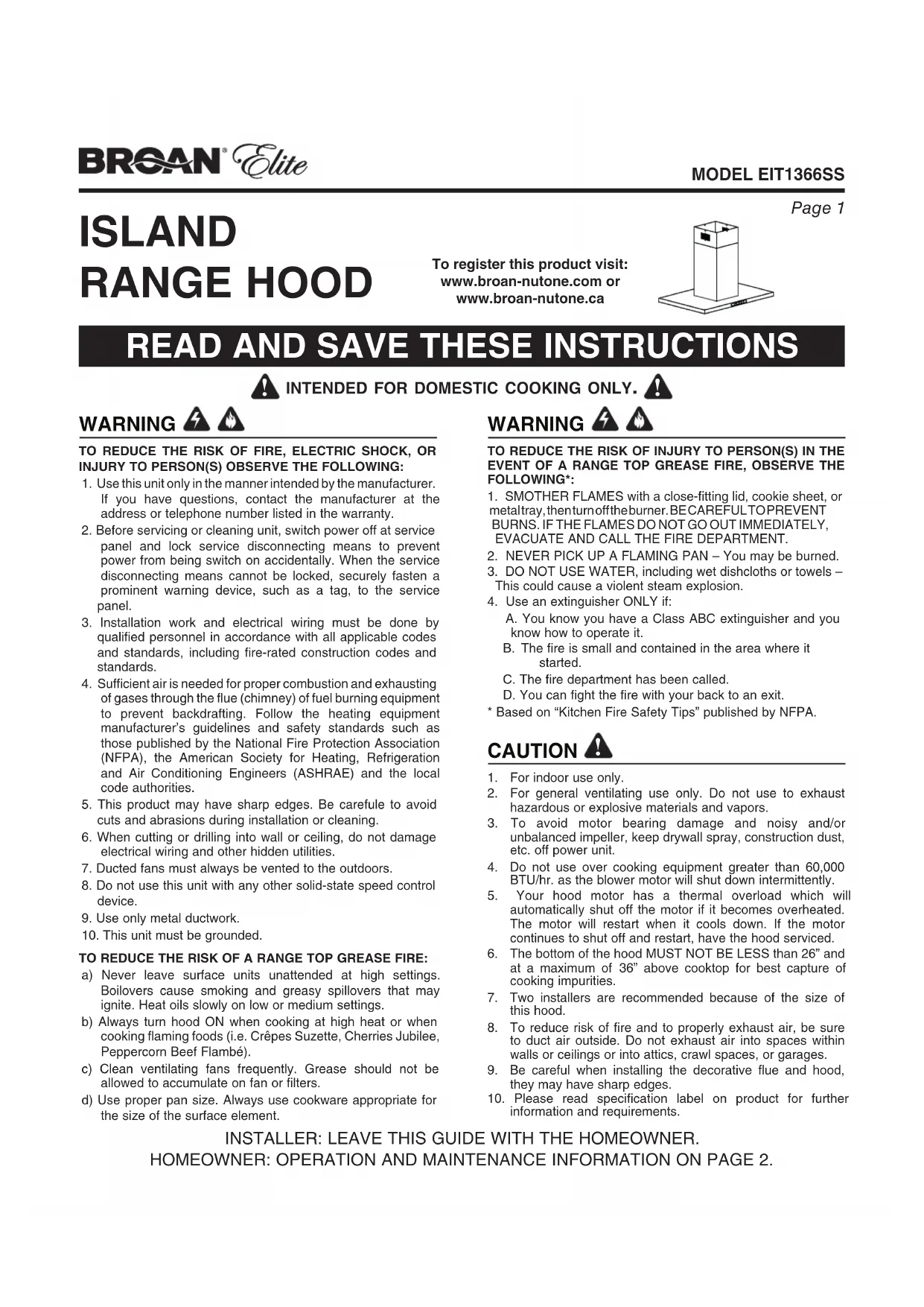 1. For indoor use only.2. For general ventilating use only. Do not use to exhaust hazardous or explosive materials and vapors.3. To avoid motor bearing damage and noisy and/or unbalanced impeller, keep drywall spray, construction dust,etc. off power unit.4. Do not use over cooking equipment greater than 60,000 BTU/hr. as the blower motor will shut down intermittently.5. Your hood motor has a thermal overload which will automatically shut off the motor if it becomes overheated.The motor will restart when it cools down. If the motorcontinues to shut off and restart, have the hood serviced.6. The bottom of the hood MUST NOT BE LESS than 26” and at a maximum of 36” above cooktop for best capture of cooking impurities.7. Two installers are recommended because of the size ofthis hood.8. To reduce risk of fire and to properly exhaust air, be sure to duct air outside. Do not exhaust air into spaces withinwalls or ceilings or into attics, crawl spaces, or garages.9. Be careful when installing the decorative flue and hood, they may have sharp edges.10. Please read specification label on product for further information and requirements.INSTALLER: LEAVE THIS GUIDE WITH THE HOMEOWNER.HOMEOWNER: OPERATION AND MAINTENANCE INFORMATION ON PAGE 2. WARNING To register this product visit: www.broan-nutone.com orwww.broan-nutone.caMODEL EIT1366SS Page 2 CLEANING & MAINTENANCE Proper maintenance of the Range Hood will assure proper performance of the unit. MOTOR The motor is permanently lubricated and never needs oiling. If the motor bearings make excessive or unusual noise, replace the blower with the exact service blower. GREASE FILTERS The grease filters should be cleaned frequently. Use a warm dishwashing detergent solution. Grease filters are dishwasher safe. Clean all-metal filters in the dishwasher using a non-phosphate detergent. Discoloration of the filters may occur if using phosphate detergents, or as a result of local water conditions - but this will not affect filter performance. This discoloration is not covered by the warranty. Remove grease filters by pulling down on the metal latch tab. This will disengage the filters from the hood. Tilt the filters downward and remove.