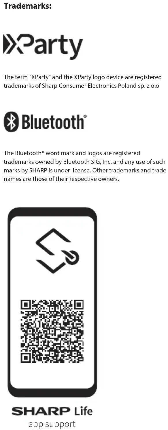 4Trademarks: The term "XParty" and the XParty logo device are registered trademarks of Sharp Consumer Electronics Poland sp. z o.o The Bluetooth® word mark and logos are registered trademarks owned by Bluetooth SIG, Inc. and any use of such marks by SHARP is under license. Other trademarks and trade names are those of their respective owners. app support3 Important safety instructions Please follow all safety instructions and heed all warnings. Keep this manual for future reference. This symbol instructs the user to consult the user manual for further safety, operation, and maintenance related information.This symbol indicates presence of uninsulated “dangerous voltage” within the product and may be of sucient magnitude as to constitute a risk of electric shock to persons.Refers to alternating current (AC)This symbol indicates that the rated voltage marked with the symbol is AC voltage.Refers to class II equipment. This symbol indicates that this product has a double insulation system and does not require a safety connection to electrical earth (ground). Precautions Damage• Please inspect the unit for damage after unpacking. If it is damaged in any way do not operate the unit and consult your dealer.Power connection and accessibility• Do not handle the power cord with wet hands as it may cause an electric shock. If the power plug does not t into your outlet, do not force the plug into an electrical socket. Switch o the unit completely before unplugging. Disconnect the power cord if it is not used for a long time. Ensure that the power plug is always easily accessible. Do not attach extension cables.Power source• Ensure that the unit is plugged into an AC 100-240V 50/60Hz power outlet. Using higher voltage may cause the unit to malfunction or even catch re.Fused moulded power plug (non rewireable) - UK, Malta, Cyprus and Ireland only.• The power lead on this equipment is supplied with a plug incorporating a 3 Amp fuse. The value of the fuse is indicated on the pin face of the plug and if it requires replacing, a fuse approved to BS1362 of the same rating must be used.Power cord protection• Do not damage the power cord, do not place any heavy objects on it, do not stretch it or bend it. Damage to the power cord can result in re or electric shock. If the power cord is damaged, it must be replaced.Child safety• Always follow basic safety precautions when using this product, especially when children are present. Children should be supervised to ensure that they do not play with the product.Location• When in use this product should be placed on a at, stable surface with no part of the main unit overhanging an edge. Insertion hazards• Slots and openings in the cabinet are provided for ventilation and to ensure reliable operation of the product protecting it from overheating. These openings must not be blocked or covered. Ensure a minimum distance of 5 cm around the product for sucient ventilation. Never let anyone push anything into holes, slots or any other openings in the product’s casing as this could result in an electric shock.Heat and operating temperature• Do not place near any heat sources such as radiators, heat registers, stoves, or other apparatus (including ampliers) that produce heat. Avoid prolonged exposure to direct sunlight.Naked ames• To prevent the risk of re, keep candles or open ames away from this product.Storms and lightning• Storms are dangerous for all electric products. If the power is struck by lightning, the product might get damaged, even if it is turned o. You should disconnect all the cables and connectors of the product before a storm.Power cable• Do not damage, stretch, bend or place heavy objects on the power cable.Damage• Please inspect the unit for damage after unpacking. If it is damaged in any way do not operate the unit and consult your dealer.Maintenance• Unplug the power cable from the power source before cleaning the product. Use a soft and clean cloth to clean the outside of the unit. Never clean it with chemicals or detergent.Service and repair CAUTION RISK OF ELECTRIC SHOCKDO NOT OPEN• This product does not contain any parts that are serviceable by the user. Exposing the internal parts inside the device may endanger your life. In case of a fault, contact the manufacturer or authorised service department. The manufacturers guarantee does not extend to faults caused by repairs carried out by unauthorised third parties. Caution: Epilepsy warning