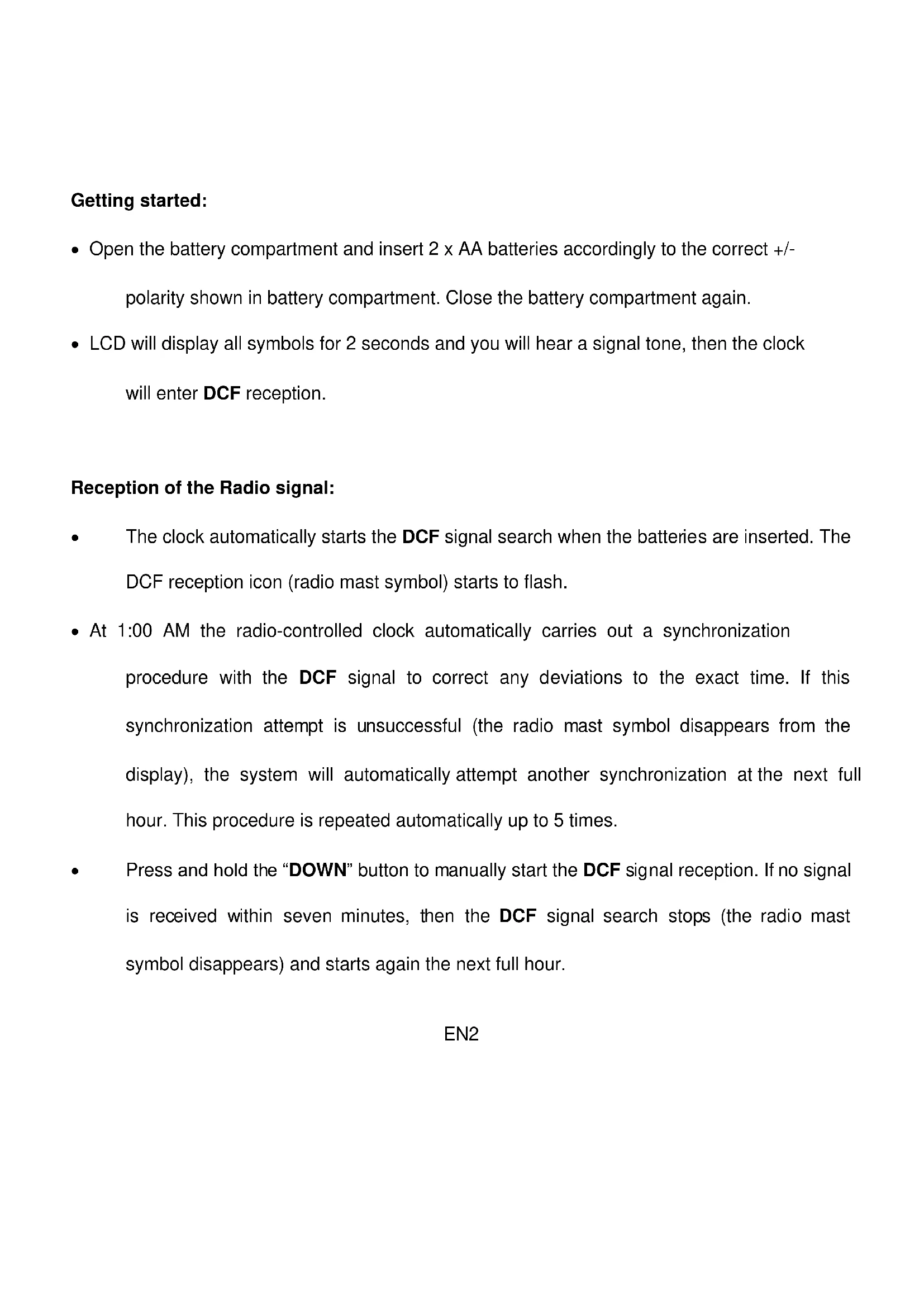 Getting started: Open the battery compartment and insert 2 x AA batteries accordingly to the correct +/- polarity shown in battery compartment. Close the battery compartment again. LCD will display all symbols for 2 seconds and you will hear a signal tone, then the clock will enter DCF reception. Reception of the Radio signal: The clock automatically starts the DCF signal search when the batteries are inserted. The DCF reception icon (radio mast symbol) starts to flash. At 1:00 AM the radio-controlled clock automatically carries out a synchronization procedure with the DCF signal to correct any deviations to the exact time. If this synchronization attempt is unsuccessful (the radio mast symbol disappears from the display), the system will automatically attempt another synchronization at the next full hour. This procedure is repeated automatically up to 5 times. Press and hold the “DOWN” button to manually start the DCF signal reception. If no signal is received within seven minutes, then the DCF signal search stops (the radio mast symbol disappears) and starts again the next full hour.EN3 Notes A flashing radio mast icon indicates that the DCF signal reception has started. A continuously displayed radio mast icon indicates that the DCF signal was received successfully If the clock cannot receive the DCF signal (because the distance is too great to receive a signal from the transmitter in Germany), you have the option of setting the time manually as mentioned above. As soon as the reception of the DCF signal is possible, then the clock is readjusted automatically. We recommend a minimum distance of 2.5 meters (8.2 Feet) to all sources of interference, such as televisions or computer monitors, Radio reception is weaker in rooms with concrete walls and in offices. In such extreme circumstances, place the system close to the window. When the clock receives the Daylight Saving Time, “DST” symbol will be shown top of the seconds. Environmental reception effects The clock obtains the accurate time with wireless technology. Same as all wireless devices, the reception is maybe affected by the following circumstances:EN4 long transmitting distance nearby mountains and valleys near freeway, railway, airports, high voltage cable etc. near construction site among tall buildings inside concrete buildings near electrical appliances (computers, TV’s, etc) and metallic structures inside moving vehicles Place the clock at a location with optimal signal, i.e. close to a window and away from metal surfaces or electrical appliances. Manual time setting: Press and hold down the “SET” button for 2 seconds, the weekday language display starts to flash. Press the “UP” or the “DOWN” button to set the correct weekday language. Language English German Italian French Dutch Spanish DanishEN5 Weekday