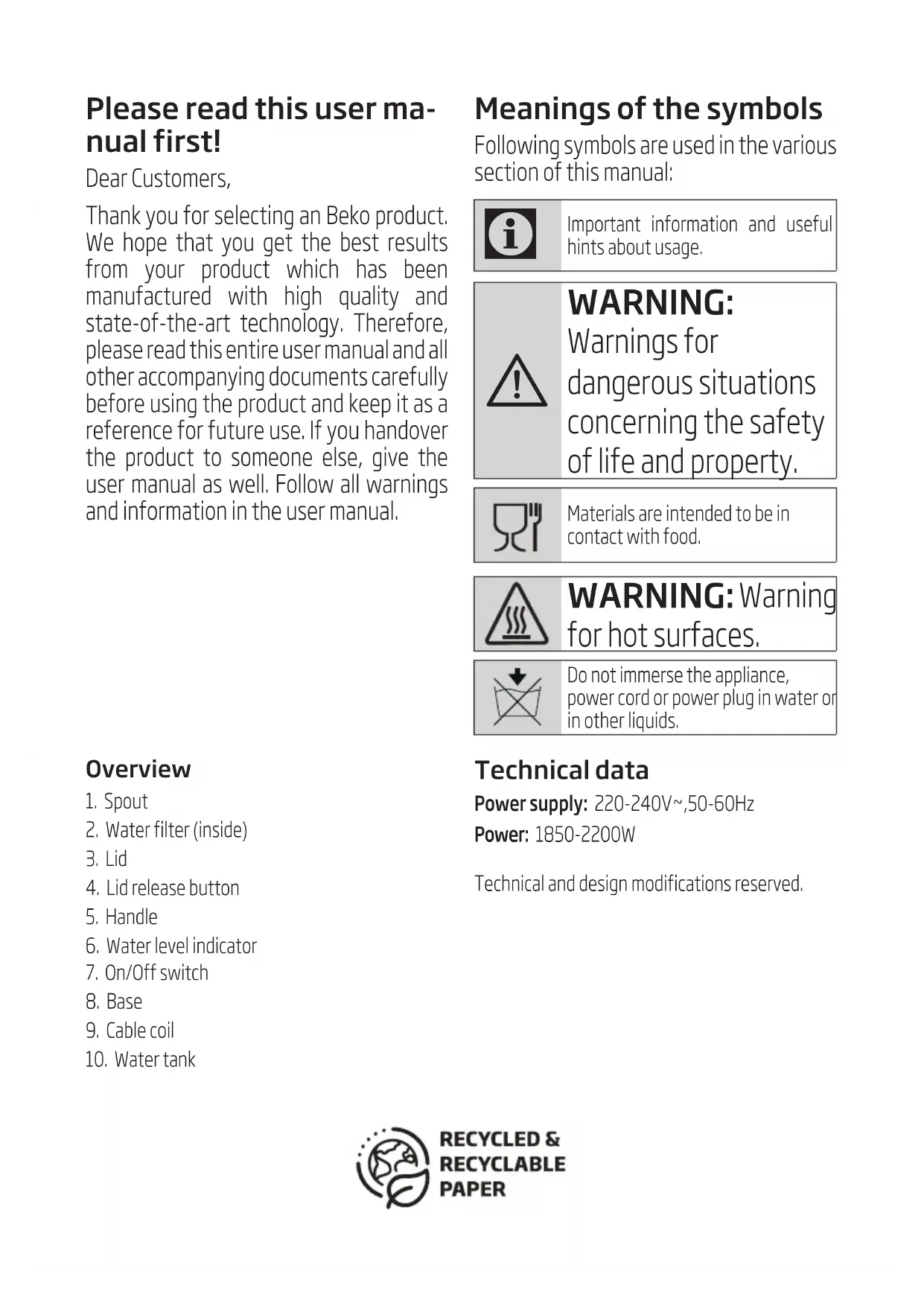 Please read ths user ma- nual frst! Dear Customers, Thank you for selectng an Beko product. We hope that you get the best results from your product whch has been manufactured wth hgh qualty and state-of-the-art technology. Therefore, please read ths entre user manual and all other accompanyng documents carefully before usng the product and keep t as a reference for future use. If you handover the product to someone else, gve the user manual as well. Follow all warnngs and nformaton n the user manual. Overview1. Spout2. Water filter (inside)3. Lid4. Lid release button5. Handle6. Water level indicator7. On/Off switch8. Base 9. Cable coil10. Water tank Technical data Power supply: 220-240V~,50-60HzPower: 1850-2200WTechnical and design modifications reserved. Meanngs of the symbols Followng symbols are used n the varous secton of ths manual: