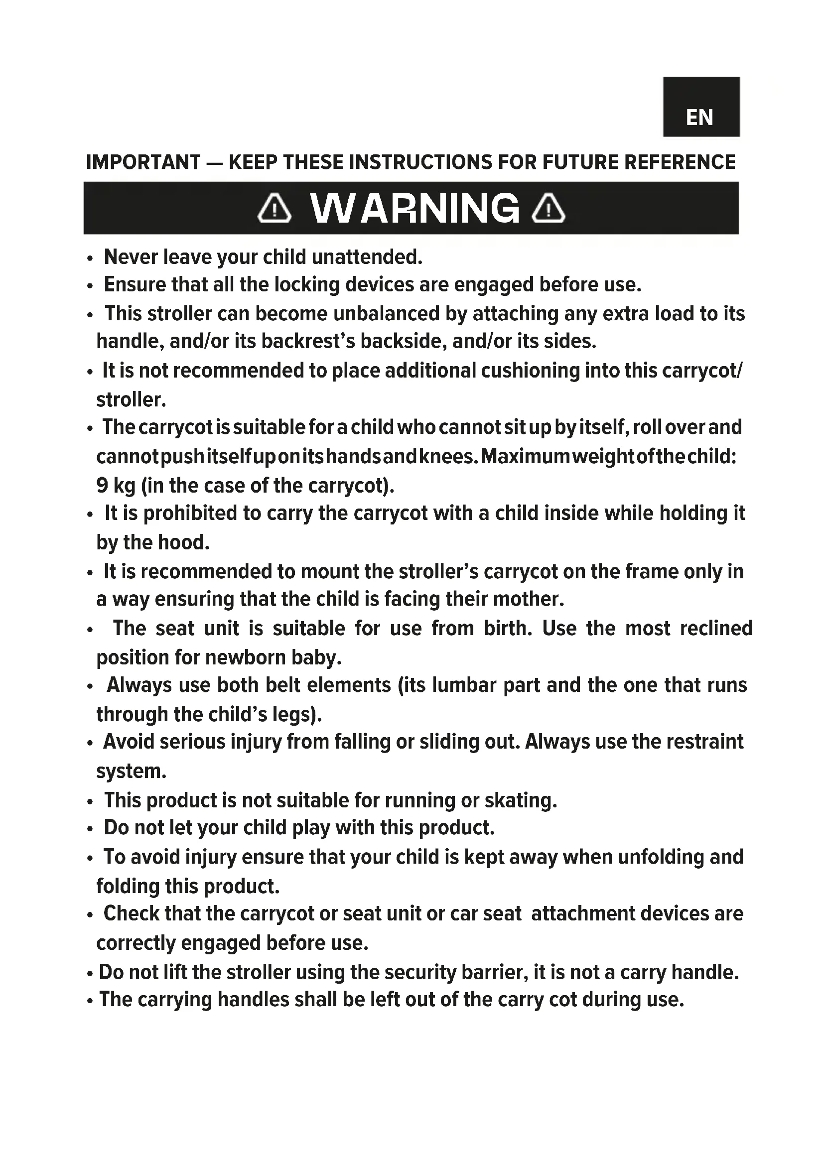 - The carrying handles shall be left out of the carry cot during use.EN5 CAUTIONS BEFORE USING OUR STROLLER, CAREFULLY READ THIS MAINTENANCE MANUAL.