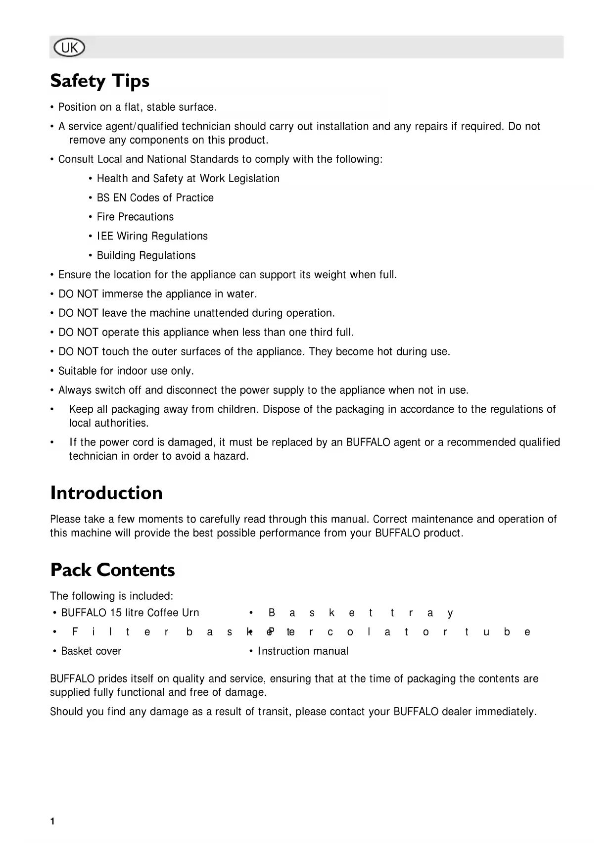 - Earth wire (coloured green/yellow) to terminal marked E This appliance must be earthed, using a dedicated earthing circuit. If in doubt consult a qualified electrician. Electrical isolation points must be kept clear of any obstructions. In the event of any emergency disconnection being required they must be readily accessible. Compliance BUFFALO parts have undergone strict product testing in order to comply with regulatory standards and specifications set by international, independent, and federal authorities. BUFFALO products have been approved to carry the following symbol: All rights reserved. No part of these instructions may be produced or transmitted in any form or by any means, electronic, mechanical, photocopying, recording or otherwise, without the prior written permission of BUFFALO. Every effort is made to ensure all details are correct at the time of going to press, however, BUFFALO reserve the right to change specifications without notice. Model Voltage Power Current Capacity Weight (full) Brewing Time (full) Dimensions w x d x h mm F249 230V 50Hz 1500W 6.5A 15 litres (100 cups) 20kg approx. 60 minutes approx. 530 x 360 x 2805