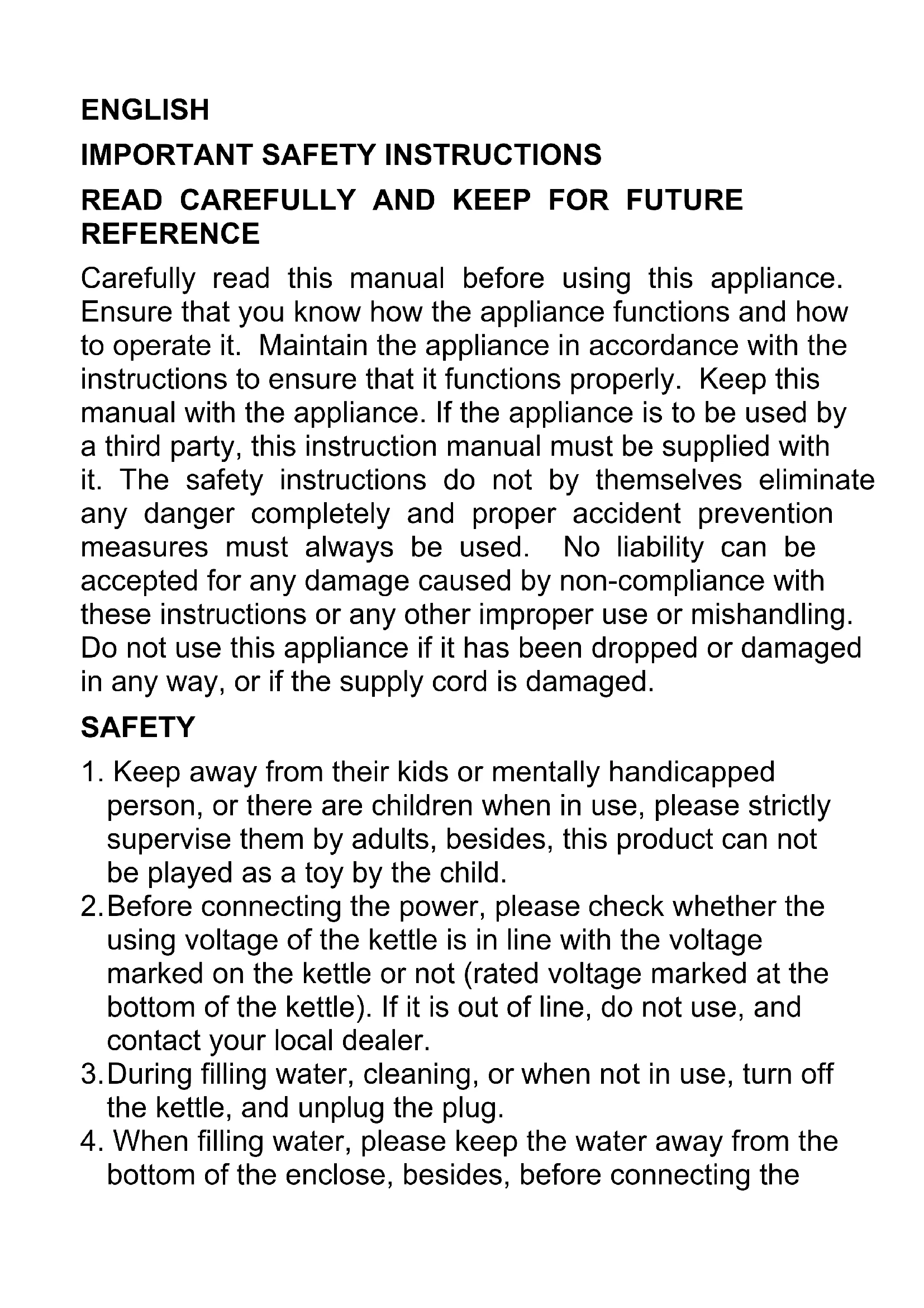 REFERENCE Carefully read this manual before using this appliance. Ensure that you know how the appliance functions and how to operate it. Maintain the appliance in accordance with the instructions to ensure that it functions properly. Keep this manual with the appliance. If the appliance is to be used by a third party, this instruction manual must be supplied with it. The safety instructions do not by themselves eliminate any danger completely and proper accident prevention measures must always be used. No liability can be accepted for any damage caused by non-compliance with these instructions or any other improper use or mishandling. Do not use this appliance if it has been dropped or damaged in any way, or if the supply cord is damaged. SAFETY