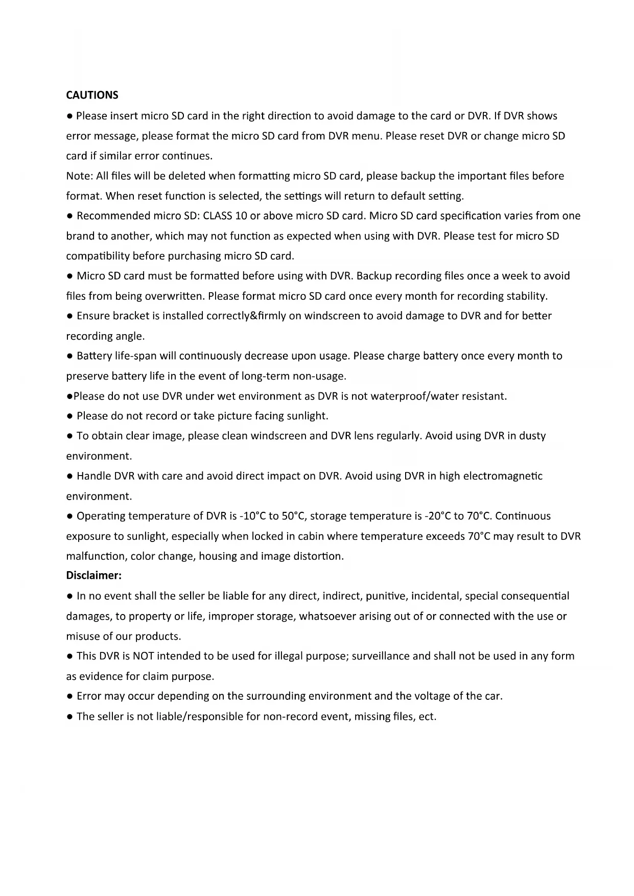 BedienungsanleitungUser ManualCAUTIONS ● Please insert micro SD card in the right direction to avoid damage to the card or DVR. If DVR shows error message, please format the micro SD card from DVR menu. Please reset DVR or change micro SD card if similar error continues. Note: All files will be deleted when formatting micro SD card, please backup the important files before format. When reset function is selected, the settings will return to default setting. ● Recommended micro SD: CLASS 10 or above micro SD card. Micro SD card specification varies from one brand to another, which may not function as expected when using with DVR. Please test for micro SD compatibility before purchasing micro SD card. ● Micro SD card must be formatted before using with DVR. Backup recording files once a week to avoid files from being overwritten. Please format micro SD card once every month for recording stability. ● Ensure bracket is installed correctly&firmly on windscreen to avoid damage to DVR and for better recording angle. ● Battery life-span will continuously decrease upon usage. Please charge battery once every month to preserve battery life in the event of long-term non-usage. ●Please do not use DVR under wet environment as DVR is not waterproof/water resistant. ● Please do not record or take picture facing sunlight. ● To obtain clear image, please clean windscreen and DVR lens regularly. Avoid using DVR in dusty environment. ● Handle DVR with care and avoid direct impact on DVR. Avoid using DVR in high electromagnetic environment. ● Operating temperature of DVR is -10°C to 50°C, storage temperature is -20°C to 70°C. Continuous exposure to sunlight, especially when locked in cabin where temperature exceeds 70°C may result to DVR malfunction, color change, housing and image distortion. Disclaimer: ● In no event shall the seller be liable for any direct, indirect, punitive, incidental, special consequential damages, to property or life, improper storage, whatsoever arising out of or connected with the use or misuse of our products. ● This DVR is NOT intended to be used for illegal purpose; surveillance and shall not be used in any form as evidence for claim purpose. ● Error may occur depending on the surrounding environment and the voltage of the car. ● The seller is not liable/responsible for non-record event, missing files, ect.1. Structure