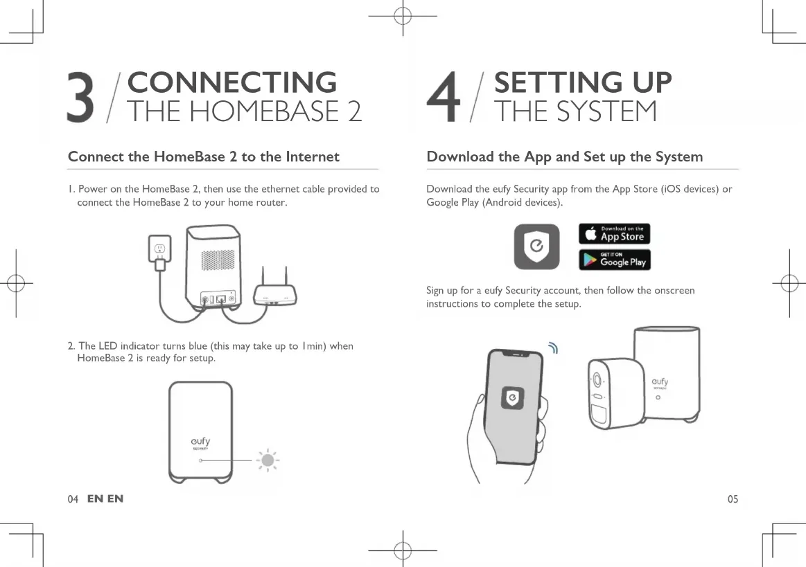 HomeBase 2 is ready for setup. SETTING UP THE SYSTEM Download the App and Set up the System Download the eufy Security app from the App Store (iOS devices) or Google Play (Android devices). Sign up for a eufy Security account, then follow the onscreen instructions to complete the setup.06 EN EN