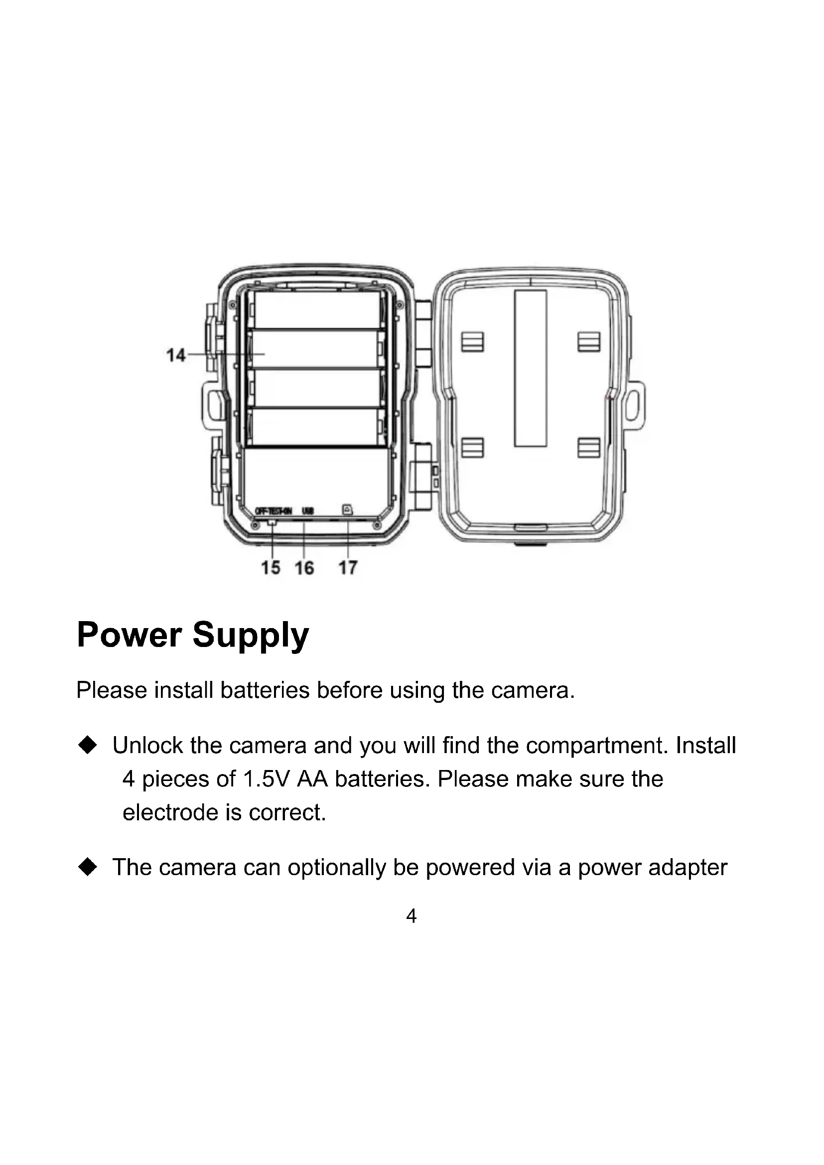 Power Supply Please install batteries before using the camera. Unlock the camera and you will find the compartment. Install 4 pieces of 1.5V AA batteries. Please make sure the electrode is correct. The camera can optionally be powered via a power adapter5 (6V 1.5A not included in delivery). Inserting the Memory Card Please prepare a Micro SD card and insert it into the camera for saving files. Before recording, please format the memory card first. Supports Micro SD card up to 256GB. We suggest using class 10 or higher. To avoid malfunction, the memory card should be far away from water, strong vibration, dust, heat sources and direct sunlight. Do not insert the memory card forcibly. Please refer to the marking on the camera. For the first use, please wait for the memory card temperature reach the ambient temperature. The environment temperature and humidity can cause a short6 circuit. Please note protection for the camera when using it outdoors. If the capacity of memory card is full, the camera will stop recording automatically. Press the edge of the card gently to pop-out the TF card. Basic Operation Turning the Camera On and Off Switch the Mode Button to “Test/On” to turn on the camera. Switch the Mode Button to “Off” to turn off the camera. System Setup Switch Mode Button to “Test”, then you can set the system parameters.7