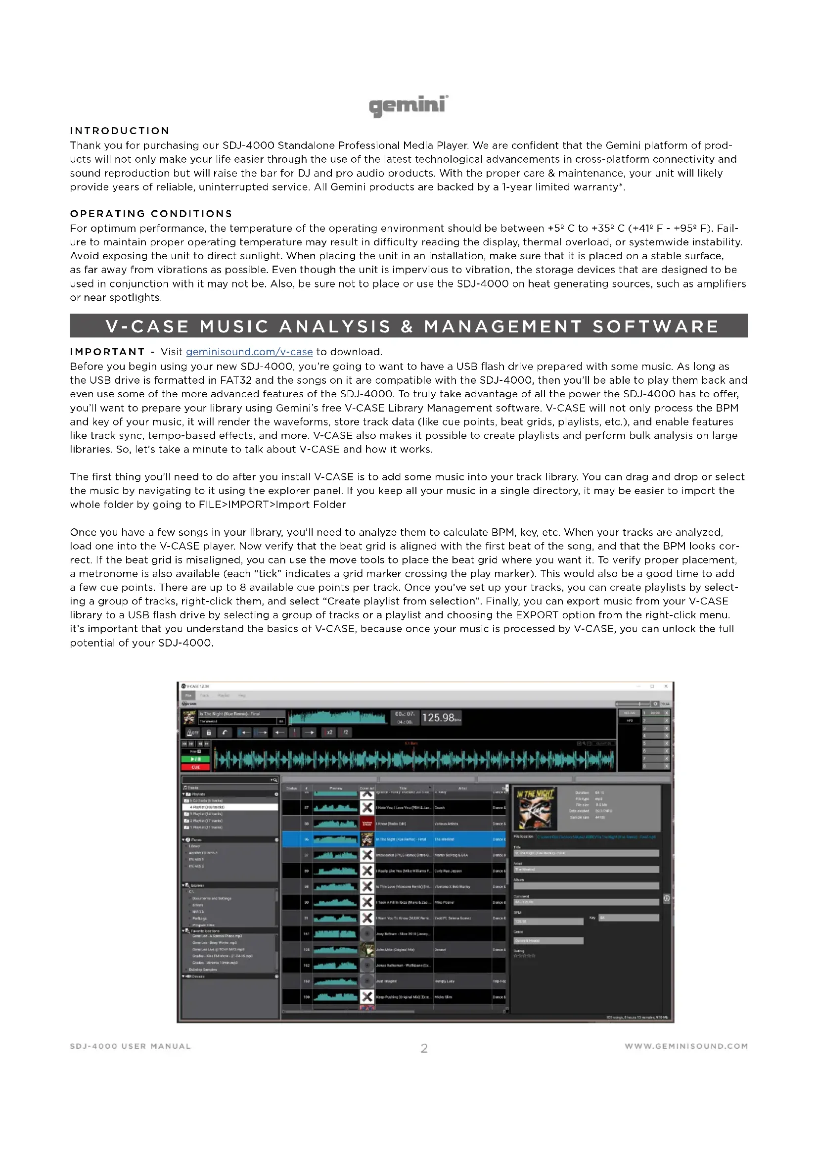 INTRODUCTION Thank you for purchasing our SDJ-4000 Standalone Professional Media Player. We are confident that the Gemini platform of prod- ucts will not only make your life easier through the use of the latest technological advancements in cross-platform connectivity and sound reproduction but will raise the bar for DJ and pro audio products. With the proper care & maintenance, your unit will likely provide years of reliable, uninterrupted service. All Gemini products are backed by a 1-year limited warranty*. OPERATING CONDITIONS For optimum performance, the temperature of the operating environment should be between +5º C to +35º C (+41º F - +95º F). Fail- ure to maintain proper operating temperature may result in diculty reading the display, thermal overload, or systemwide instability. Avoid exposing the unit to direct sunlight. When placing the unit in an installation, make sure that it is placed on a stable surface, as far away from vibrations as possible. Even though the unit is impervious to vibration, the storage devices that are designed to be used in conjunction with it may not be. Also, be sure not to place or use the SDJ-4000 on heat generating sources, such as amplifiers or near spotlights. IMPORTANT - Visit geminisound.com/v-case to download. Before you begin using your new SDJ-4000, you’re going to want to have a USB flash drive prepared with some music. As long as the USB drive is formatted in FAT32 and the songs on it are compatible with the SDJ-4000, then you’ll be able to play them back and even use some of the more advanced features of the SDJ-4000. To truly take advantage of all the power the SDJ-4000 has to oer, you’ll want to prepare your library using Gemini’s free V-CASE Library Management software. V-CASE will not only process the BPM and key of your music, it will render the waveforms, store track data (like cue points, beat grids, playlists, etc.), and enable features like track sync, tempo-based eects, and more. V-CASE also makes it possible to create playlists and perform bulk analysis on large libraries. So, let’s take a minute to talk about V-CASE and how it works. The first thing you’ll need to do after you install V-CASE is to add some music into your track library. You can drag and drop or select the music by navigating to it using the explorer panel. If you keep all your music in a single directory, it may be easier to import the whole folder by going to FILE>IMPORT>Import Folder Once you have a few songs in your library, you’ll need to analyze them to calculate BPM, key, etc. When your tracks are analyzed, load one into the V-CASE player. Now verify that the beat grid is aligned with the first beat of the song, and that the BPM looks cor- rect. If the beat grid is misaligned, you can use the move tools to place the beat grid where you want it. To verify proper placement, a metronome is also available (each “tick” indicates a grid marker crossing the play marker). This would also be a good time to add a few cue points. There are up to 8 available cue points per track. Once you’ve set up your tracks, you can create playlists by select- ing a group of tracks, right-click them, and select “Create playlist from selection”. Finally, you can export music from your V-CASE library to a USB flash drive by selecting a group of tracks or a playlist and choosing the EXPORT option from the right-click menu. it’s important that you understand the basics of V-CASE, because once your music is processed by V-CASE, you can unlock the full potential of your SDJ-4000. V-CASE MUSIC ANALYSIS & MANAGEMENT SOFTWAREWWW.GEMINISOUND.COM
