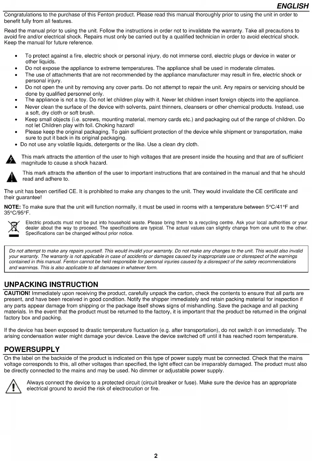 UNPACKING INSTRUCTION CAUTION! Immediately upon receiving the product, carefully unpack the carton, check the contents to ensure that all parts are present, and have been received in good condition. Notify the shipper immediately and retain packing material for inspection if any parts appear damage from shipping or the package itself shows signs of mishandling. Save the package and all packing materials. In the event that the product must be returned to the factory, it is important that the product be returned in the original factory box and packing. If the device has been exposed to drastic temperature fluctuation (e.g. after transportation), do not switch it on immediately. The arising condensation water might damage your device. Leave the device switched off until it has reached room temperature. POWERSUPPLY On the label on the backside of the product is indicated on this type of power supply must be connected. Check that the mains voltage corresponds to this, all other voltages than specified, the light effect can be irreparably damaged. The product must also be directly connected to the mains and may be used. No dimmer or adjustable power supply. Always connect the device to a protected circuit (circuit breaker or fuse). Make sure the device has an appropriate electrical ground to avoid the risk of electrocution or fire. Do not attempt to make any repairs yourself. This would invalid your warranty. Do not make any changes to the unit. This would also invalid your warranty. The warranty is not applicable in case of accidents or damages caused by inappropriate use or disrespect of the warnings contained in this manual. Fenton cannot be held responsible for personal injuries caused by a disrespect of the safety recommendations and warnings. This is also applicable to all damages in whatever form.3 OPERATION Connecting Power Plug the supplied AC adapter into the DC jack on the rear side of the unit and connect to a standard AC wall socket with 230V~ 50Hz continuous power supply. Note: When the unit is not operated for long periods of time, unplug the AC adapter from the unit and wall outlet.