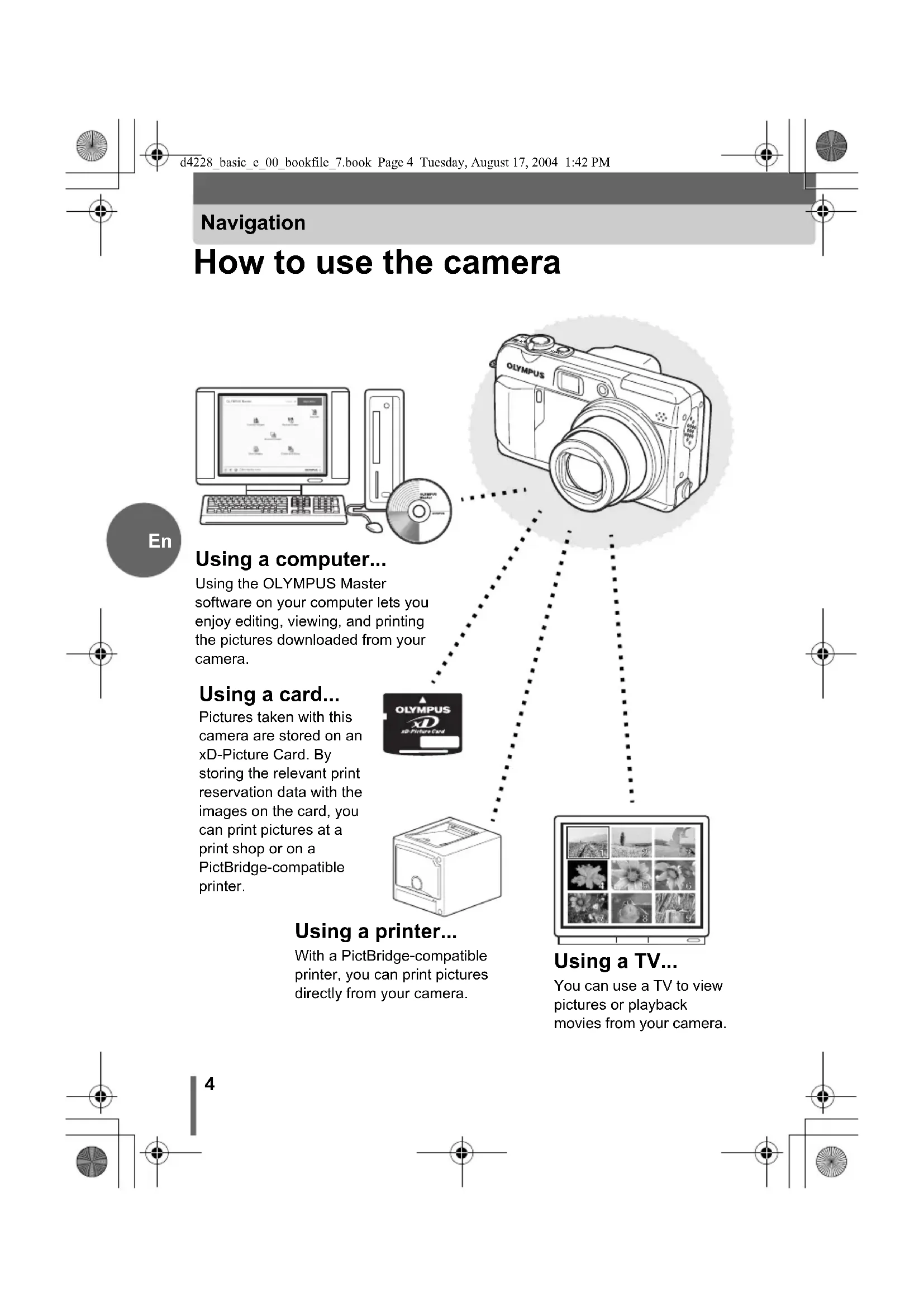Using a card... Pictures taken with this camera are stored on an xD-Picture Card. By storing the relevant print reservation data with the images on the card, you can print pictures at a print shop or on a PictBridge-compatible printer. Using a computer... Using the OLYMPUS Master software on your computer lets you enjoy editing, viewing, and printing the pictures downloaded from your camera. Using a printer... With a PictBridge-compatible printer, you can print pictures directly from your camera. Using a TV... You can use a TV to view pictures or playback movies from your camera. d4228_basic_e_00_bookfile_7.book Page 4 Tuesday, August 17, 2004 1:42 PM5
