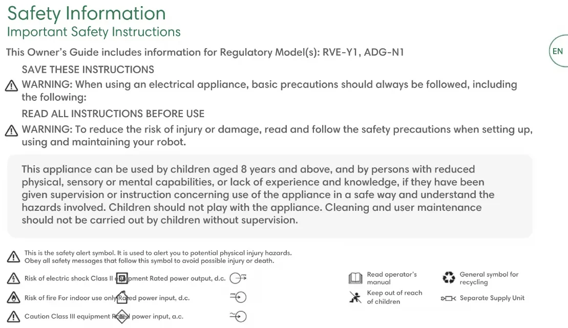 This Owner’s Guide includes information for Regulatory Model(s): RVE-Y1, ADG-N1 This is the safety alert symbol. It is used to alert you to potential physical injury hazards. Obey all safety messages that follow this symbol to avoid possible injury or death.Risk of electric shock Class II equipment Rated power output, d.c. Read operator’s manualGeneral symbol for recyclingRisk of re For indoor use only Rated power input, d.c.Keep out of reach ofchildrenSeparate Supply UnitCaution Class III equipment Rated power input, a.c.EN
