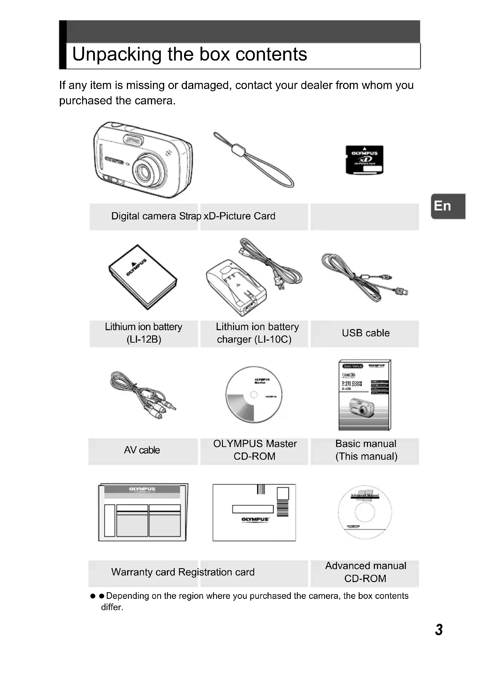 Unpacking the box contents If any item is missing or damaged, contact your dealer from whom you purchased the camera. Depending on the region where you purchased the camera, the box contents differ. Digital camera Strap xD-Picture Card Lithium ion battery (LI-12B) Lithium ion battery charger (LI-10C) USB cable AV cable OLYMPUS Master CD-ROM Basic manual (This manual) Warranty card Registration card Advanced manual CD-ROM D-590 ZOOMC-470 ZOOMX-500Basic ManualDIGITAL CAMERA 000e_kihonhen.book Page 3 Tuesday, August 24, 2004 1:49 PM4