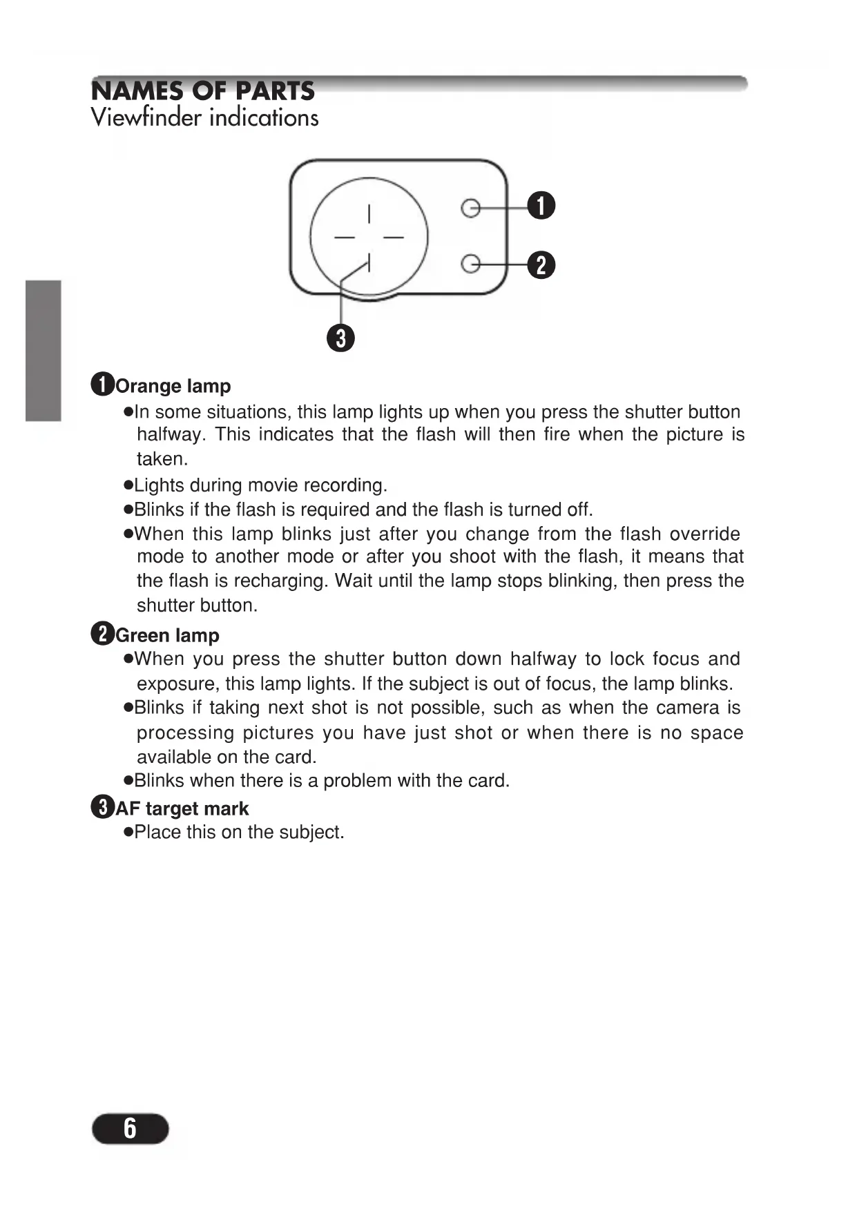 Viewfinder indications 1 Orange lamp ● In some situations, this lamp lights up when you press the shutter button halfway. This indicates that the flash will then fire when the picture is taken. ● Lights during movie recording. ● Blinks if the flash is required and the flash is turned off. ● When this lamp blinks just after you change from the flash override mode to another mode or after you shoot with the flash, it means that the flash is recharging. Wait until the lamp stops blinking, then press the shutter button. 2 Green lamp ● When you press the shutter button down halfway to lock focus and exposure, this lamp lights. If the subject is out of focus, the lamp blinks. ● Blinks if taking next shot is not possible, such as when the camera is processing pictures you have just shot or when there is no space available on the card. ● Blinks when there is a problem with the card. 3 AF target mark ● Place this on the subject.