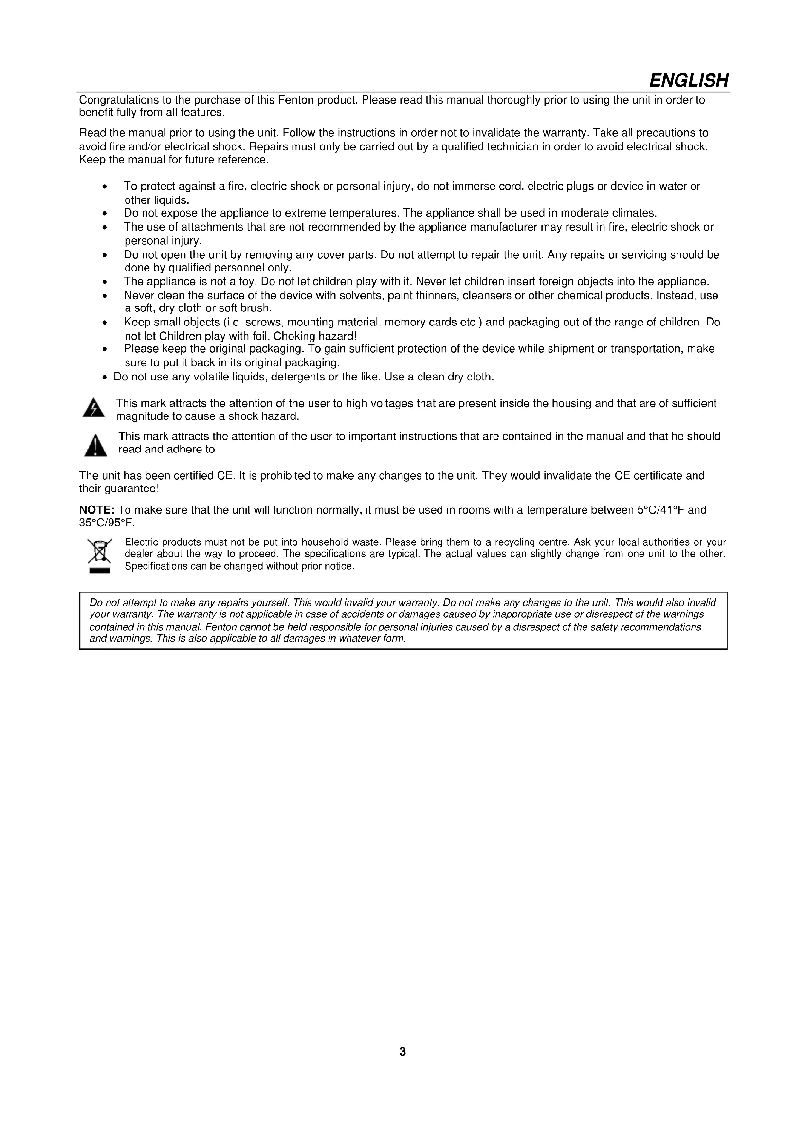V1.123 ENGLISH Congratulations to the purchase of this Fenton product. Please read this manual thoroughly prior to using the unit in order to benefit fully from all features. Read the manual prior to using the unit. Follow the instructions in order not to invalidate the warranty. Take all precautions to avoid fire and/or electrical shock. Repairs must only be carried out by a qualified technician in order to avoid electrical shock. Keep the manual for future reference.