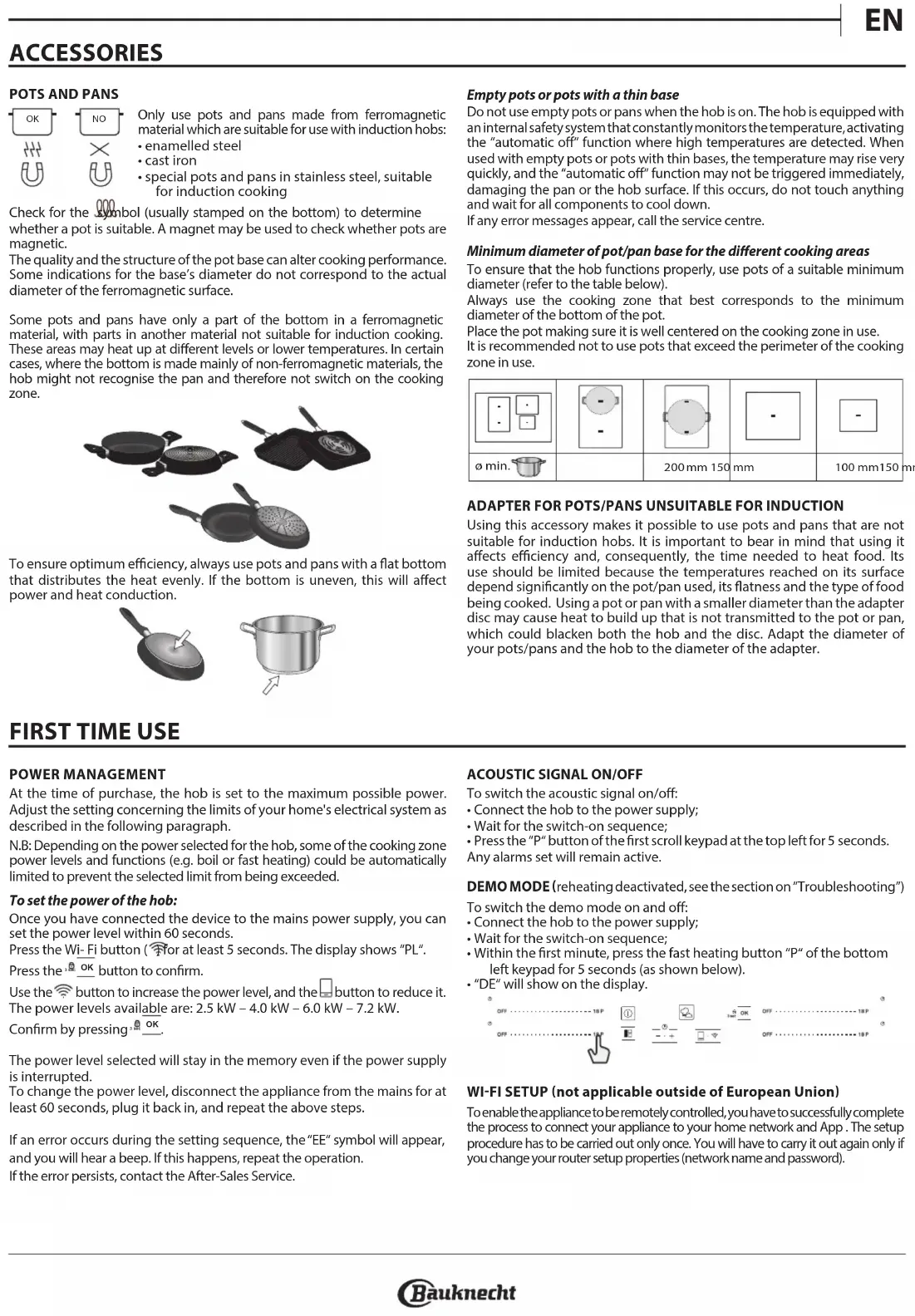The hob automatically sets a minimum power level to ensure that the cooking zone can be used. The power regulator limits the power levels in accordance with the maximum value set for the hob. See paragraph “Power management“. EN400011687627 What can I do if Wi-Fi’s Led is blinking or the appliance is unable to establish a stable connection to my home router? The appliance might have successfully connected to the router, but it is not able to access the Internet. To connect the appliance to the Internet, you will need to check the router and/or carrier settings. Router settings: NAT must be on, rewall and DHCP must be properly congured. Password encryption supported: WEP, WPA,WPA2. To try a dierent encryption type, please refer to the router manual. Carrier settings: If your Internet service provider has xed the number of MAC addresses able to connect to the Internet, you may not be able to connect your appliance to the cloud. The MAC address of a device is its unique identier. Please ask your Internet service provider how to connect devices other than computers to the Internet. How can I check whether data is being transmitted? After setting up the network, switch the power o, wait 20 seconds and then switch on the appliance: Check that the app is showing the UI status of the appliance. Some settings take several seconds to appear in the app. How can I change my Whirlpool account but keep my appliances connected? You can create a new account, but remember to remove your appliances from your old account before moving them to your new one. I changed my router – what do I need to do? If you can keep the previous network name and password in the new router, then you have nothing to do, the appliance will reconnect automatically. Otherwise to reconnect the appliance to the new Wi-Fi network just press “+“ in the App home page without unclaiming the appliance and follow the instructions of the App. AFTERSALES SERVICE To receive complete assistance, please register your product on www.bauknecht.eu/register. BEFORE CALLING THE AFTER-SALES SERVICE: