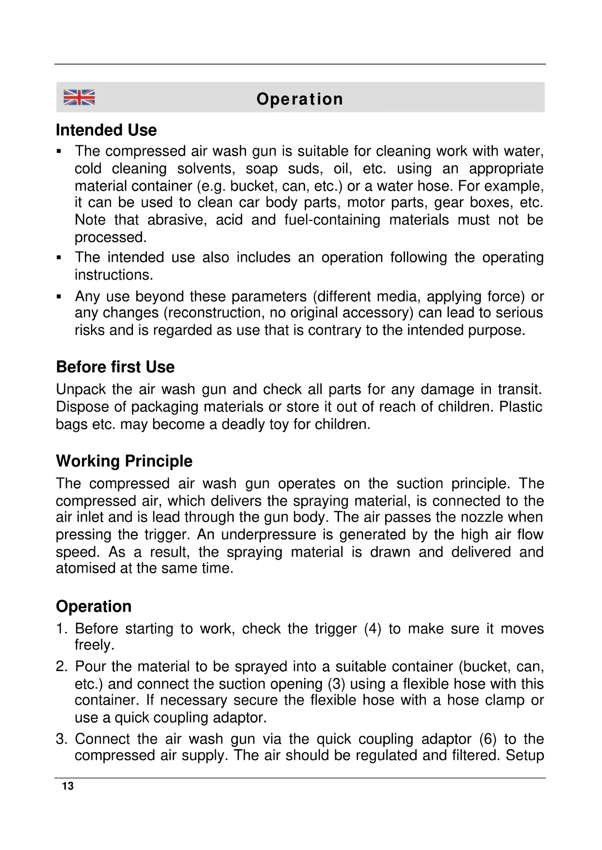 Betriebsdruck 4 – 7 bar Max. Betriebsdruck 8 bar Materialdurchsatz Ca. 0,5 l/min – 6,8 l/min Luftverbrauch 70 – 130 l/min Düsendurchmesser 2,5 mm Druckluftanschluss R ¼“ mit Schnellkupplungsadapter Abmessungen Ca. 260 x 155 x 37 mm Gewicht 277 g13 Operation Intended Use The compressed air wash gun is suitable for cleaning work with water, cold cleaning solvents, soap suds, oil, etc. using an appropriate material container (e.g. bucket, can, etc.) or a water hose. For example, it can be used to clean car body parts, motor parts, gear boxes, etc. Note that abrasive, acid and fuel-containing materials must not be processed. The intended use also includes an operation following the operating instructions. Any use beyond these parameters (different media, applying force) or any changes (reconstruction, no original accessory) can lead to serious risks and is regarded as use that is contrary to the intended purpose. Before first Use Unpack the air wash gun and check all parts for any damage in transit. Dispose of packaging materials or store it out of reach of children. Plastic bags etc. may become a deadly toy for children. Working Principle The compressed air wash gun operates on the suction principle. The compressed air, which delivers the spraying material, is connected to the air inlet and is lead through the gun body. The air passes the nozzle when pressing the trigger. An underpressure is generated by the high air flow speed. As a result, the spraying material is drawn and delivered and atomised at the same time. Operation