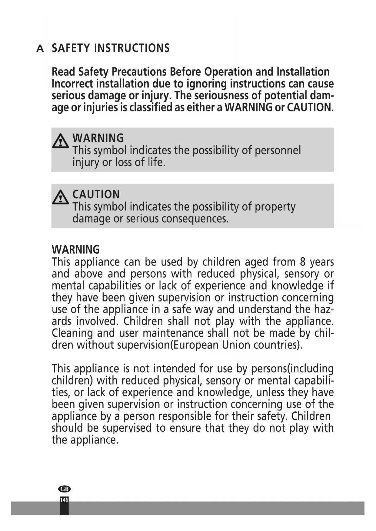 SAFETY INSTRUCTIONS Read Safety Precautions Before Operation and lnstallation Incorrect installation due to ignoring instructions can cause serious damage or injury. The seriousness of potential dam- age or injuries is classified as either a WARNING or CAUTION. WARNING This symbol indicates the possibility of personnel injury or loss of life. CAUTION This symbol indicates the possibility of property damage or serious consequences. WARNING This appliance can be used by children aged from 8 years and above and persons with reduced physical, sensory or mental capabilities or lack of experience and knowledge if they have been given supervision or instruction concerning use of the appliance in a safe way and understand the haz- ards involved. Children shall not play with the appliance. Cleaning and user maintenance shall not be made by chil- dren without supervision(European Union countries). This appliance is not intended for use by persons(including children) with reduced physical, sensory or mental capabili- ties, or lack of experience and knowledge, unless they have been given supervision or instruction concerning use of the appliance by a person responsible for their safety. Children should be supervised to ensure that they do not play with the appliance.