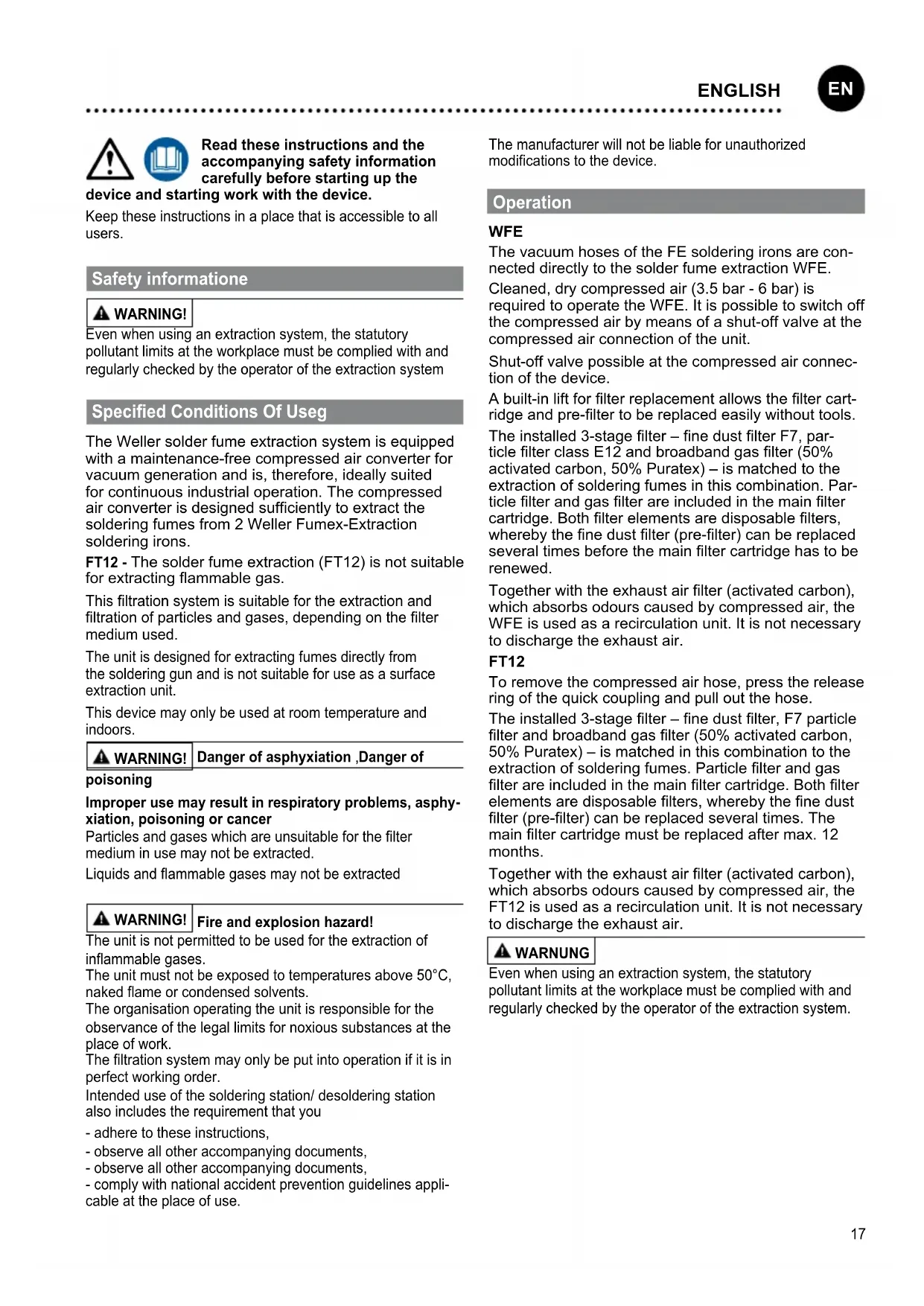- as per maintenance schedule Contaminated lters must be treated as special waste. Wear suitable protective gear. Notice Different uxes and ux constituents and the amount of and size of dust particles in the extracted air will signi cantly effect the lters working life.Submicron particles in the extracted air increase when soldering or welding to varnish insulated wire. Warranty Claims by the buyer for physical defects are time-barred after a period of one year from delivery to the buyer. This does not apply to claims by the buyer for indemnication in accordance with §§ 478, 479 BGB (German Federal Law Gazette). We shall only be liable for claims arising from a warranty furnished by us if the quality or durability warranty has been furnished by use in writing and using the term „Warranty“. The warranty shall be void if damage is due to improper use and if the device has been tampered with by unauthorized persons. Subject to technical alterations and amendments. For more information please visit www.weller-tools.com Technical Data Solder fume extraction WFE FT12 Operating pressure (oil-free, dry com- pressed air) bar psi 3,5 - 6