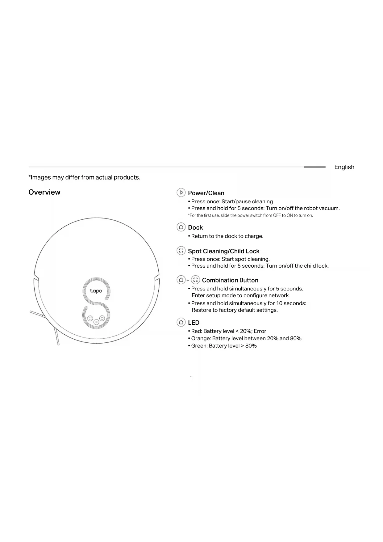 - Return to the dock to charge. Spot Cleaning/Child Lock