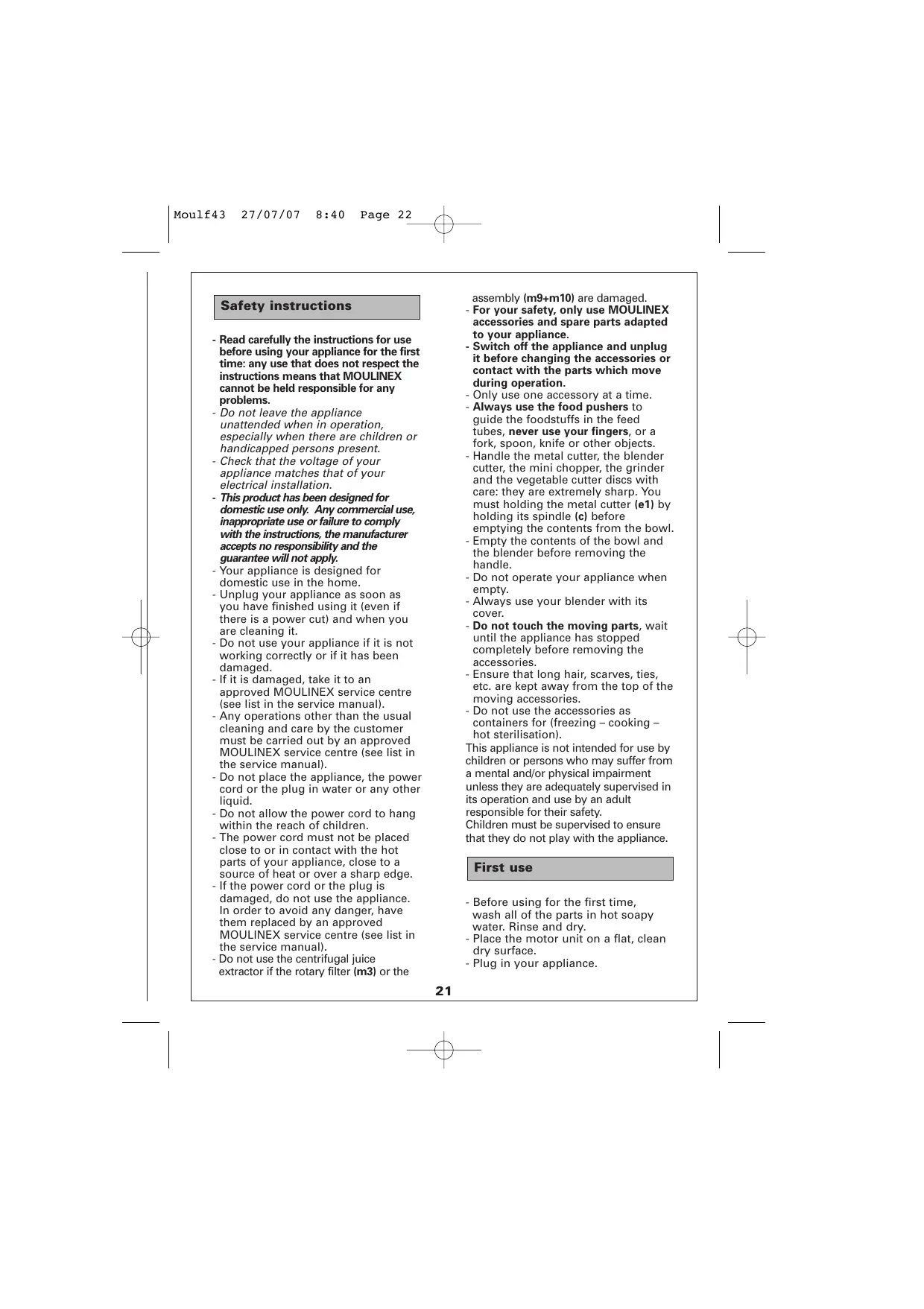 assembly (m9+m10) are damaged. - For your safety, only use MOULINEX accessories and spare parts adapted to your appliance. - Switch off the appliance and unplug it before changing the accessories or contact with the parts which move during operation. - Only use one accessory at a time. - Always use the food pushers to guide the foodstuffs in the feed tubes, never use your fingers, or a fork, spoon, knife or other objects. - Handle the metal cutter, the blender cutter, the mini chopper, the grinder and the vegetable cutter discs with care: they are extremely sharp. You must holding the metal cutter (e1) by holding its spindle (c) before emptying the contents from the bowl. - Empty the contents of the bowl and the blender before removing the handle. - Do not operate your appliance when empty. - Always use your blender with its cover. - Do not touch the moving parts, wait until the appliance has stopped completely before removing the accessories. - Ensure that long hair, scarves, ties, etc. are kept away from the top of the moving accessories. - Do not use the accessories as containers for (freezing – cooking – hot sterilisation). This appliance is not intended for use by children or persons who may suffer from a mental and/or physical impairment unless they are adequately supervised in its operation and use by an adult responsible for their safety. Children must be supervised to ensure that they do not play with the appliance.