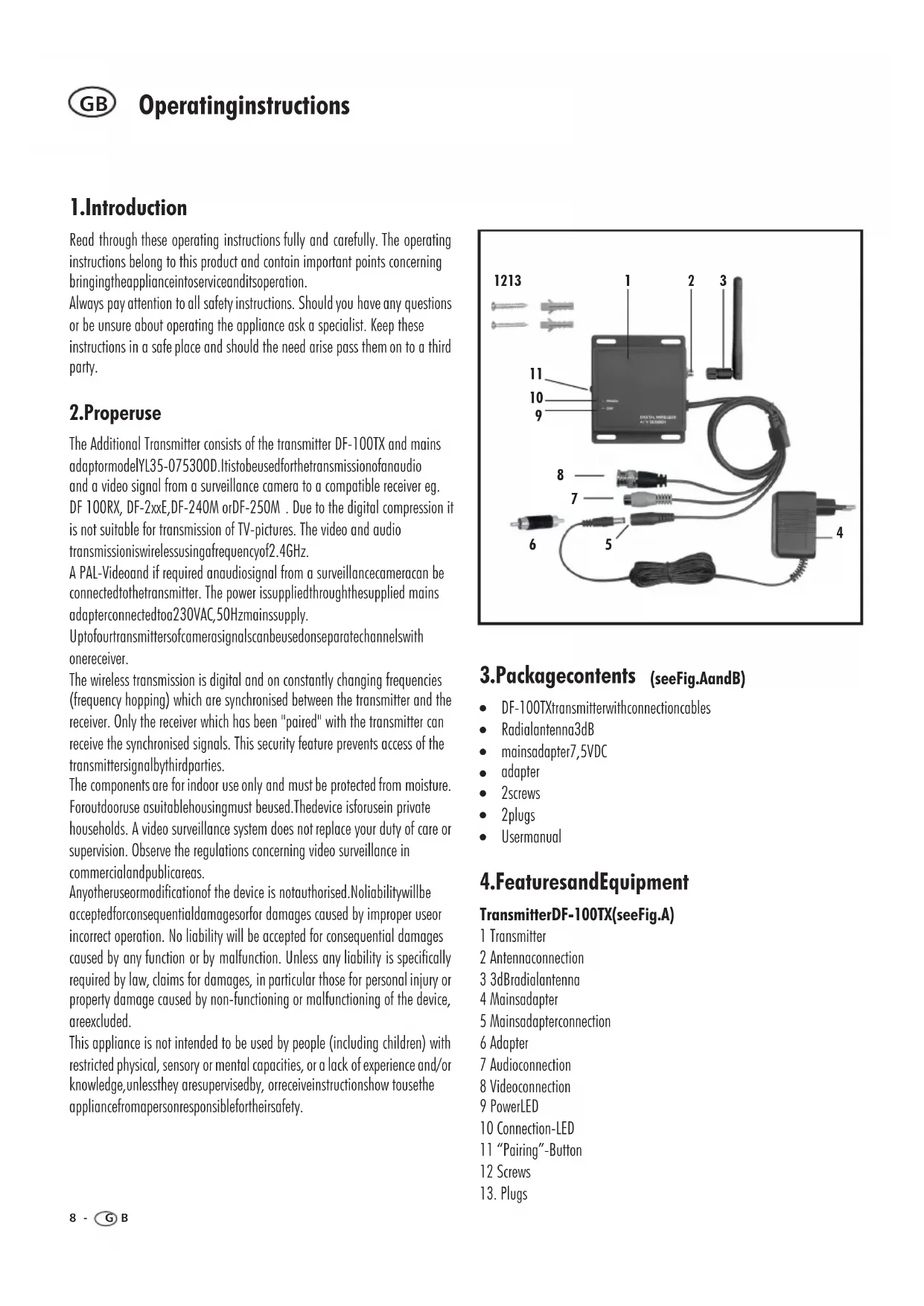 The Additional Transmitter consists of the transmitter DF-100TX and mainsadaptormodelYL35-075300D.Itistobeusedforthetransmissionofanaudioand a video signal from a surveillance camera to a compatible receiver eg.. Due to the digital compression itis not suitable for transmission of TV-pictures. The video and audiotransmissioniswirelessusingafrequencyof2.4GHz.A PAL-Videoand if required anaudiosignal from a surveillancecameracan beconnectedtothetransmitter. The power issuppliedthroughthesupplied mainsadapterconnectedtoa230VAC,50Hzmainssupply.Uptofourtransmittersofcamerasignalscanbeusedonseparatechannelswithonereceiver.The wireless transmission is digital and on constantly changing frequencies (frequency hopping) which are synchronised between the transmitter and the receiver. Only the receiver which has been "paired" with the transmitter canreceive the synchronised signals. This security feature prevents access of thetransmittersignalbythirdparties. The components are for indoor use only and must be protected from moisture. Foroutdooruse asuitablehousingmust beused.Thedevice isforusein private households. A video surveillance system does not replace your duty of care or supervision. Observe the regulations concerning video surveillance incommercialandpublicareas.Anyotheruseormodificationof the device is notauthorised.Noliabilitywillbeacceptedforconsequentialdamagesorfor damages caused by improper useorincorrect operation. No liability will be accepted for consequential damages caused by any function or by malfunction. Unless any liability is specifically required by law, claims for damages, in particular those for personal injury or property damage caused by non-functioning or malfunctioning of the device, areexcluded. This appliance is not intended to be used by people (including children) with restricted physical, sensory ormentalcapacities,or a lack ofexperienceand/or knowledge,unlessthey aresupervisedby, orreceiveinstructionshow tousetheappliancefromapersonresponsiblefortheirsafety. Read through these operating instructions fully and carefully. The operating instructions belong to this product and contain important points concerningbringingtheapplianceintoserviceanditsoperation. Always payattention toall safety instructions. Should you have any questions or be unsure about operating the appliance ask a specialist. Keep these instructions in a safe place and should the need arise pass them on to a third party.DF 100RX, DF-2xxE,DF-240M orDF-250M