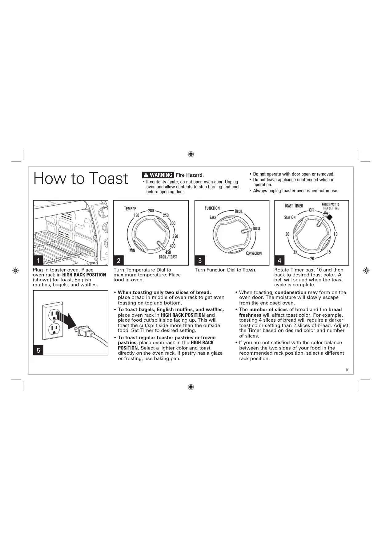 Slide-Out Crumb Tray Toasting/Baking/Broiling Oven Rack Oven Door Baking/Broiling Pan Temperature Dial Function Dial Timer ON Indicator Light CAUTION: HOT SURFACE. The temperature of accessible surfaces may be high when the appliance is operating.5 How to Toast