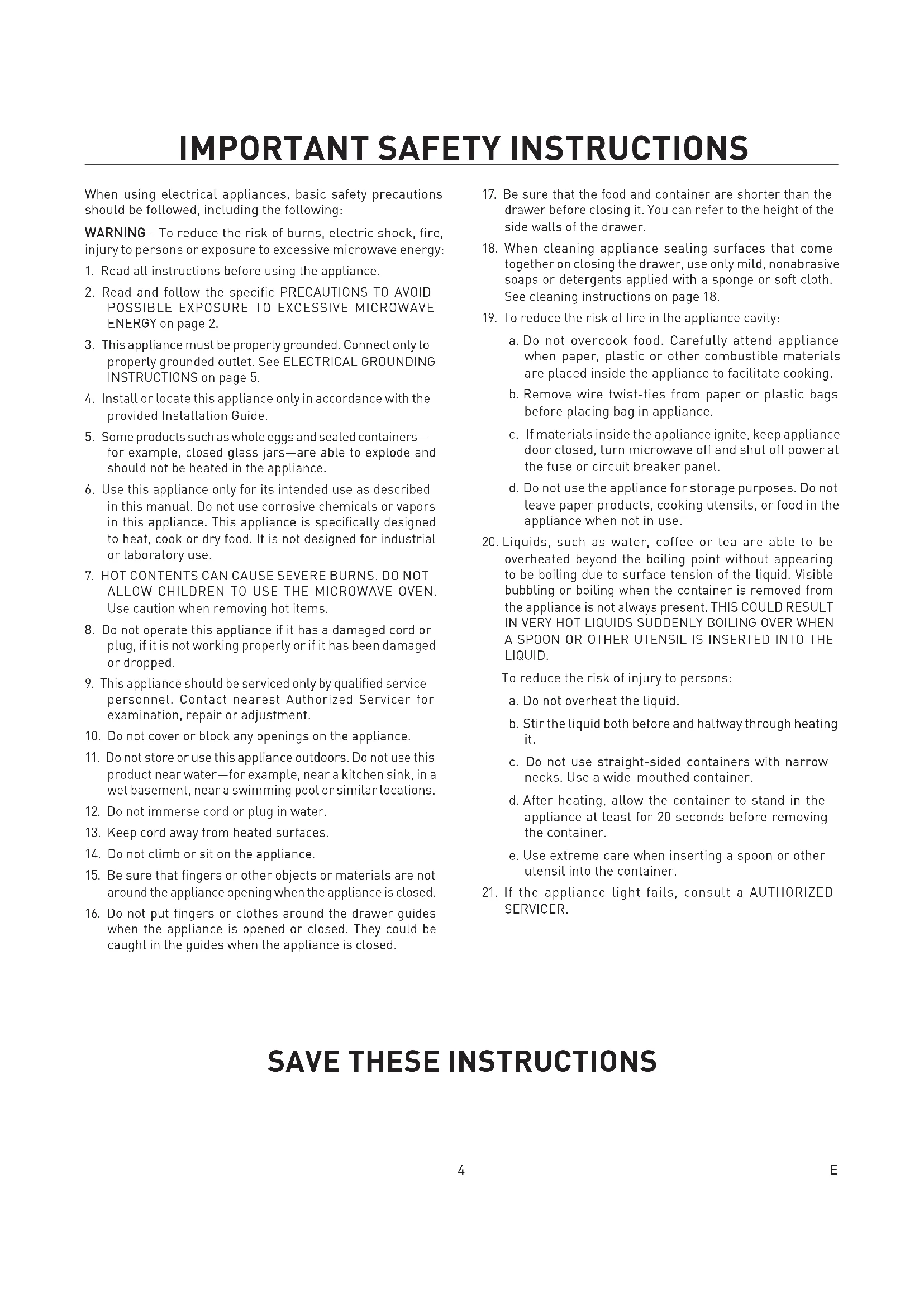WARRANTY .......................................................................... 20 CONTENTS4 E When using electrical appliances, basic safety precautions should be followed, including the following: WARNING - To reduce the risk of burns, electric shock, fire, injury to persons or exposure to excessive microwave energy: