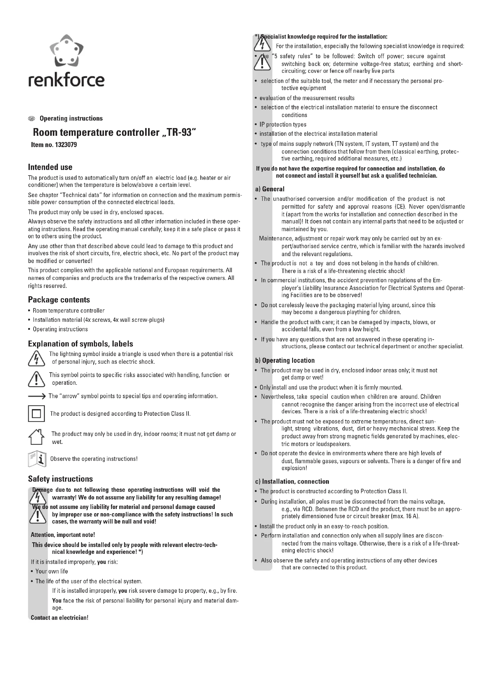 Download the instructions for your Thermostat in PDF format for free! Find your manual TR93 - Renkforce and take your electronic device back in hand. On this page are published all the documents necessary for the use of your device. TR93 by Renkforce.