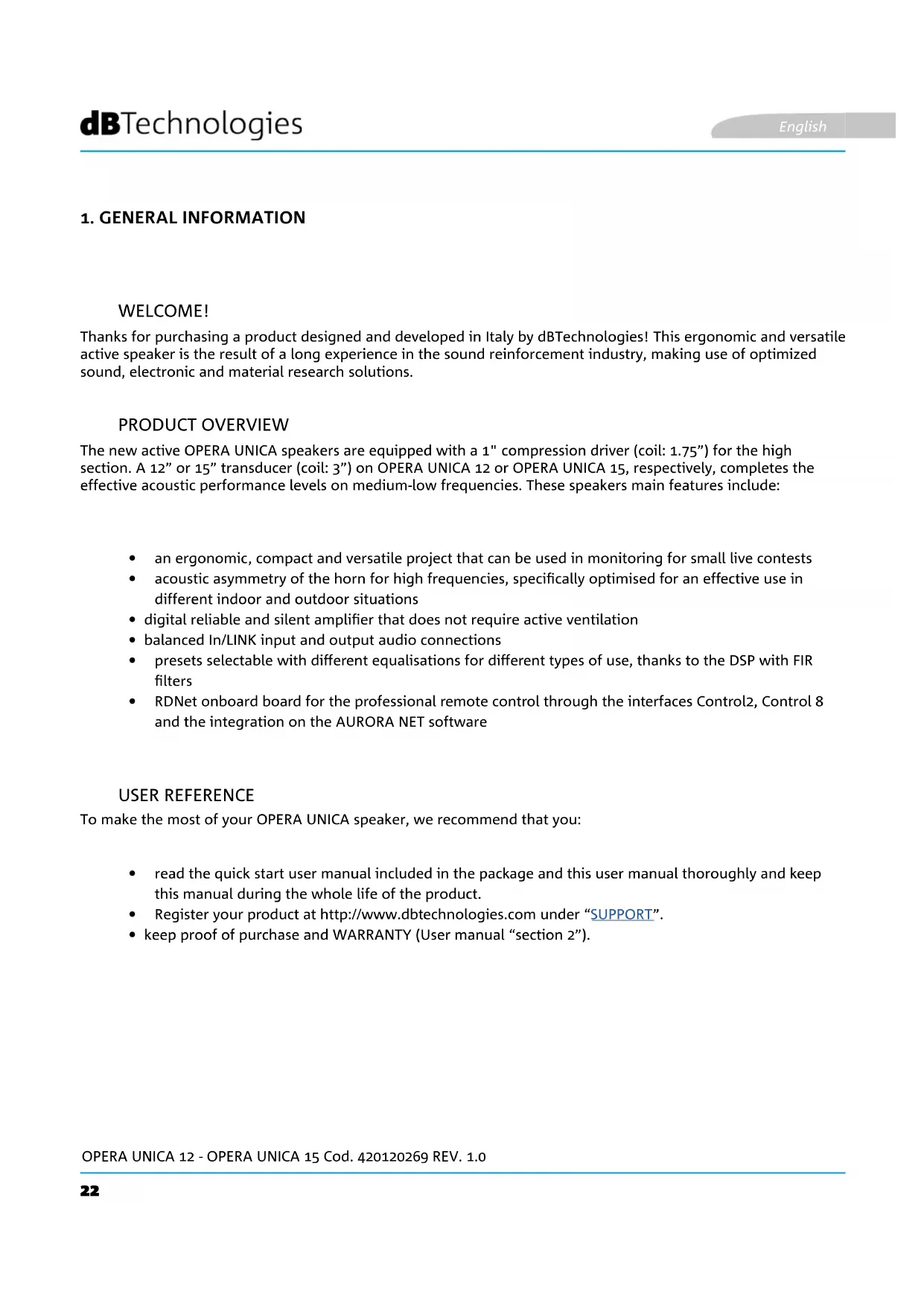 WELCOME! PRODUCT OVERVIEW USER REFERENCE Thanks for purchasing a product designed and developed in Italy by dBTechnologies! This ergonomic and versatile active speaker is the result of a long experience in the sound reinforcement industry, making use of optimized sound, electronic and material research solutions. The new active OPERA UNICA speakers are equipped with a 1" compression driver (coil: 1.75”) for the high section. A 12” or 15” transducer (coil: 3”) on OPERA UNICA 12 or OPERA UNICA 15, respectively, completes the effective acoustic performance levels on medium-low frequencies. These speakers main features include: To make the most of your OPERA UNICA speaker, we recommend that you: