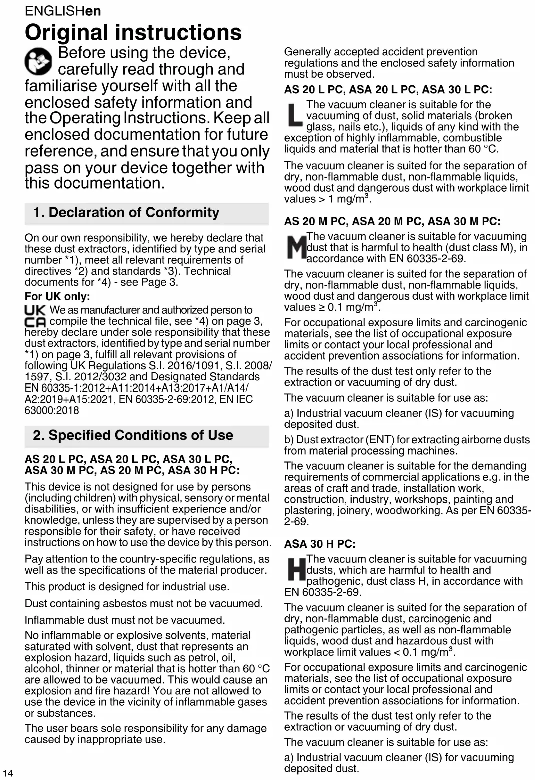 Original instructions Before using the device, carefully read through and familiarise yourself with all the enclosed safety information and the Operating Instructions. Keep all enclosed documentation for future reference, and ensure that you only pass on your device together with this documentation. On our own responsibility, we hereby declare that these dust extractors, identified by type and serial number *1), meet all relevant requirements of directives *2) and standards *3). Technical documents for *4) - see Page 3. For UK only: We as manufacturer and authorized person to compile the technical file, see *4) on page 3, hereby declare under sole responsibility that these dust extractors, identified by type and serial number *1) on page 3, fulfill all relevant provisions of following UK Regulations S.I. 2016/1091, S.I. 2008/ 1597, S.I. 2012/3032 and Designated Standards EN 60335-1:2012+A11:2014+A13:2017+A1/A14/ A2:2019+A15:2021, EN 60335-2-69:2012, EN IEC 63000:2018 AS 20 L PC, ASA 20 L PC, ASA 30 L PC, ASA 30 M PC, AS 20 M PC, ASA 30 H PC: This device is not designed for use by persons (including children) with physical, sensory or mental disabilities, or with insufficient experience and/or knowledge, unless they are supervised by a person responsible for their safety, or have received instructions on how to use the device by this person. Pay attention to the country-specific regulations, as well as the specifications of the material producer. This product is designed for industrial use. Dust containing asbestos must not be vacuumed. Inflammable dust must not be vacuumed. No inflammable or explosive solvents, material saturated with solvent, dust that represents an explosion hazard, liquids such as petrol, oil, alcohol, thinner or material that is hotter than 60 °C are allowed to be vacuumed. This would cause an explosion and fire hazard! You are not allowed to use the device in the vicinity of inflammable gases or substances. The user bears sole responsibility for any damage caused by inappropriate use. Generally accepted accident prevention regulations and the enclosed safety information must be observed. AS 20 L PC, ASA 20 L PC, ASA 30 L PC: The vacuum cleaner is suitable for the vacuuming of dust, solid materials (broken glass, nails etc.), liquids of any kind with the exception of highly inflammable, combustible liquids and material that is hotter than 60 °C. The vacuum cleaner is suited for the separation of dry, non-flammable dust, non-flammable liquids, wood dust and dangerous dust with workplace limit values > 1 mg/m³. AS 20 M PC, ASA 20 M PC, ASA 30 M PC: The vacuum cleaner is suitable for vacuuming dust that is harmful to health (dust class M), in accordance with EN 60335-2-69. The vacuum cleaner is suited for the separation of dry, non-flammable dust, non-flammable liquids, wood dust and dangerous dust with workplace limit values ≥ 0.1 mg/m³. For occupational exposure limits and carcinogenic materials, see the list of occupational exposure limits or contact your local professional and accident prevention associations for information. The results of the dust test only refer to the extraction or vacuuming of dry dust. The vacuum cleaner is suitable for use as: a) Industrial vacuum cleaner (IS) for vacuuming deposited dust. b) Dust extractor (ENT) for extracting airborne dusts from material processing machines. The vacuum cleaner is suitable for the demanding requirements of commercial applications e.g. in the areas of craft and trade, installation work, construction, industry, workshops, painting and plastering, joinery, woodworking. As per EN 60335- 2-69. ASA 30 H PC: The vacuum cleaner is suitable for vacuuming dusts, which are harmful to health and pathogenic, dust class H, in accordance with EN 60335-2-69. The vacuum cleaner is suited for the separation of dry, non-flammable dust, carcinogenic and pathogenic particles, as well as non-flammable liquids, wood dust and hazardous dust with workplace limit values < 0.1 mg/m³. For occupational exposure limits and carcinogenic materials, see the list of occupational exposure limits or contact your local professional and accident prevention associations for information. The results of the dust test only refer to the extraction or vacuuming of dry dust. The vacuum cleaner is suitable for use as: a) Industrial vacuum cleaner (IS) for vacuuming deposited dust.
