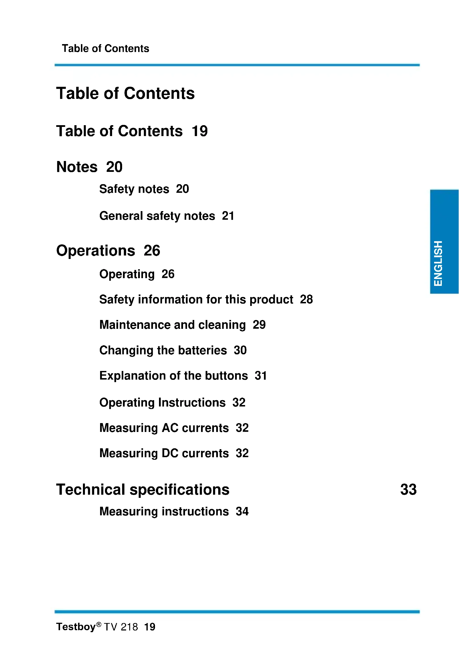 TV 218 19 DEUTSCH DEUTSCH ENGLISH Table of Contents Table of Contents 19 Notes 20 Safety notes 20 General safety notes 21 Operations 26 Operating 26 Safety information for this product 28 Maintenance and cleaning 29 Changing the batteries 30 Explanation of the buttons 31 Operating Instructions 32 Measuring AC currents 32 Measuring DC currents 32 Technical specifications 33 Measuring instructions 34Notes