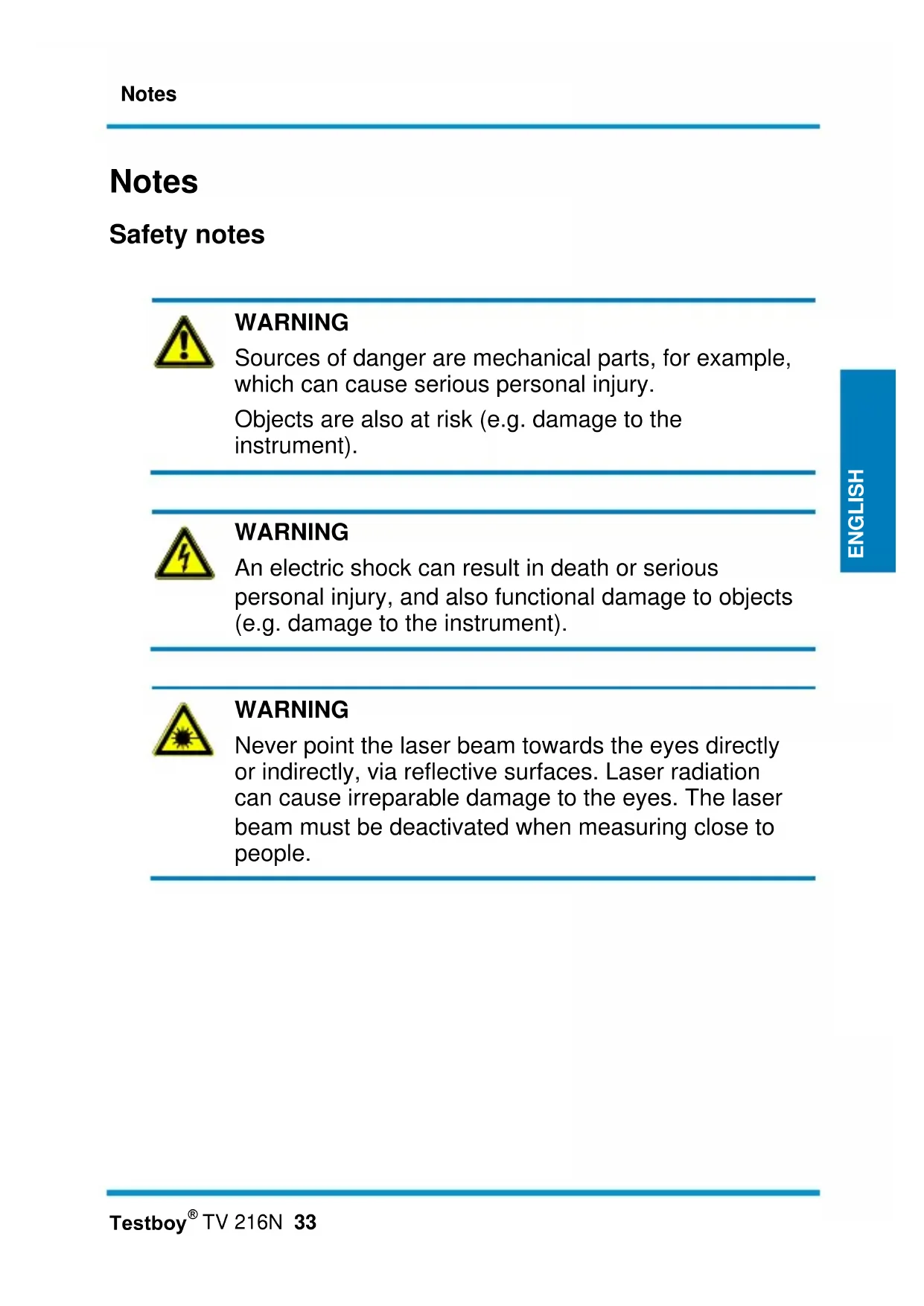 WARNING Never point the laser beam towards the eyes directly or indirectly, via reflective surfaces. Laser radiation can cause irreparable damage to the eyes. The laser beam must be deactivated when measuring close to people.Notes
