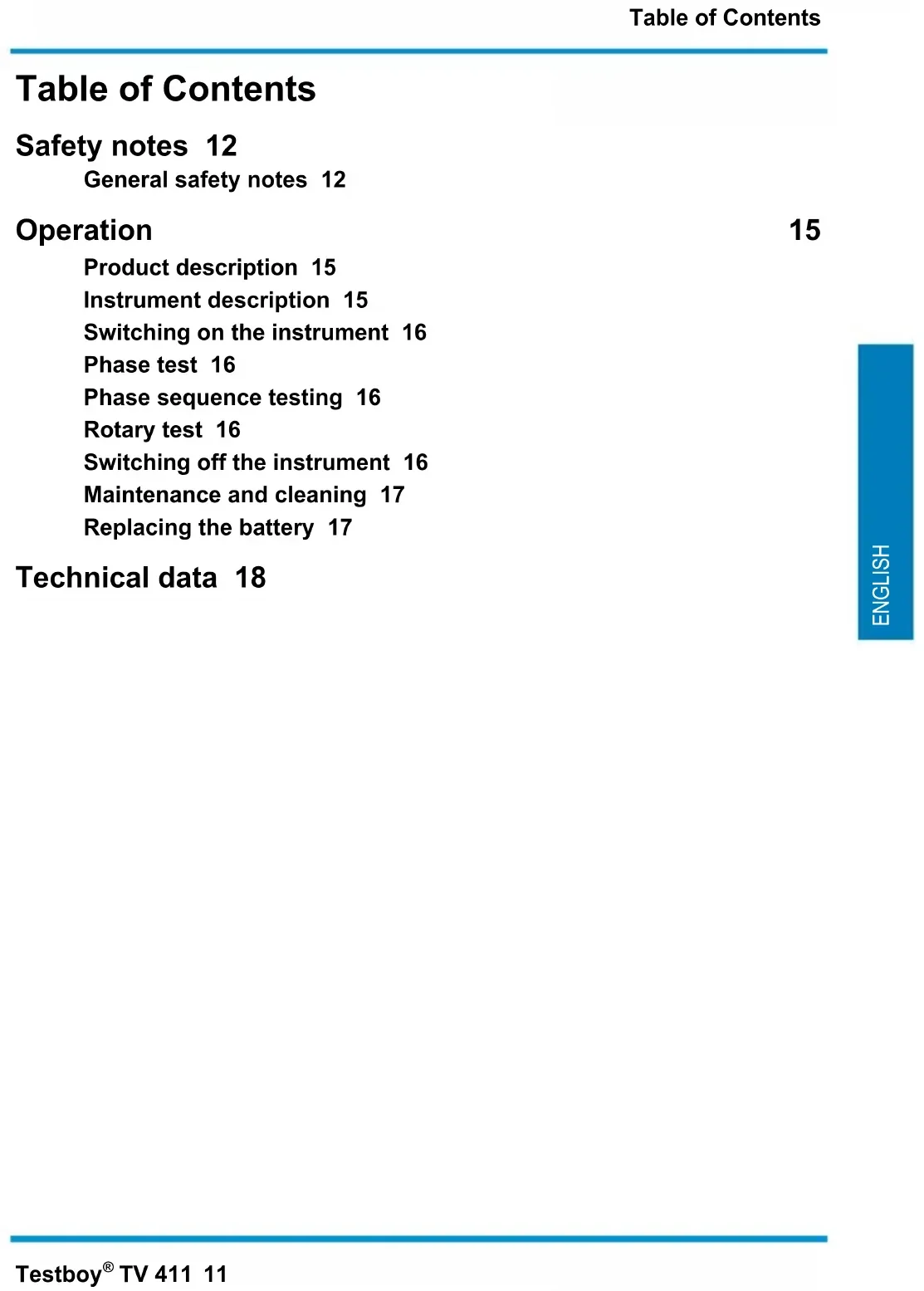 TV 411 11 ENGLISH Table of Contents Safety notes 12 General safety notes 12 Operation 15 Product description 15 Instrument description 15 Switching on the instrument 16 Phase test 16 Phase sequence testing 16 Rotary test 16 Switching off the instrument 16 Maintenance and cleaning 17 Replacing the battery 17 Technical data 18Safety notes 12 Testboy
