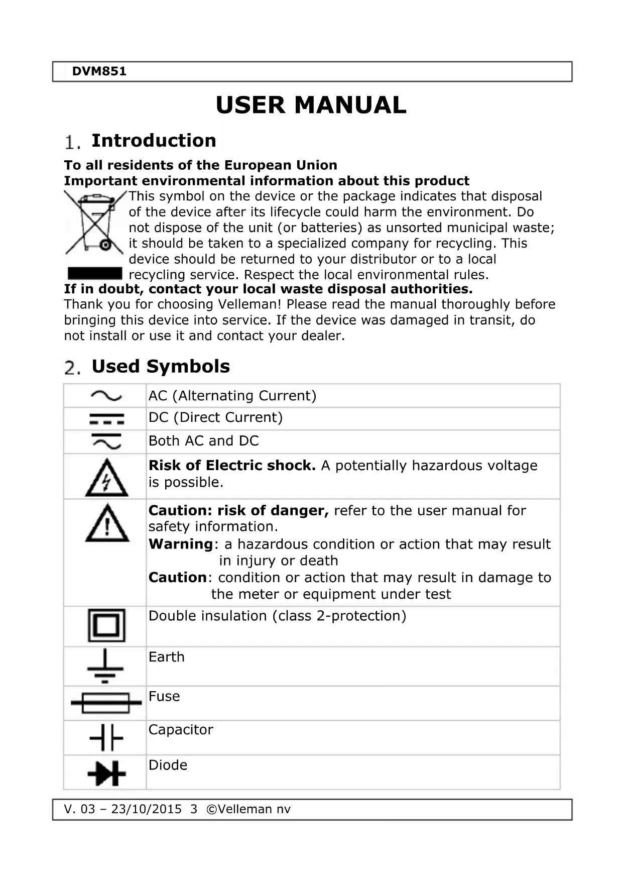 USER MANUAL Introduction To all residents of the European Union Important environmental information about this product This symbol on the device or the package indicates that disposal of the device after its lifecycle could harm the environment. Do not dispose of the unit (or batteries) as unsorted municipal waste; it should be taken to a specialized company for recycling. This device should be returned to your distributor or to a local recycling service. Respect the local environmental rules. If in doubt, contact your local waste disposal authorities. Thank you for choosing Velleman! Please read the manual thoroughly before bringing this device into service. If the device was damaged in transit, do not install or use it and contact your dealer. Used Symbols