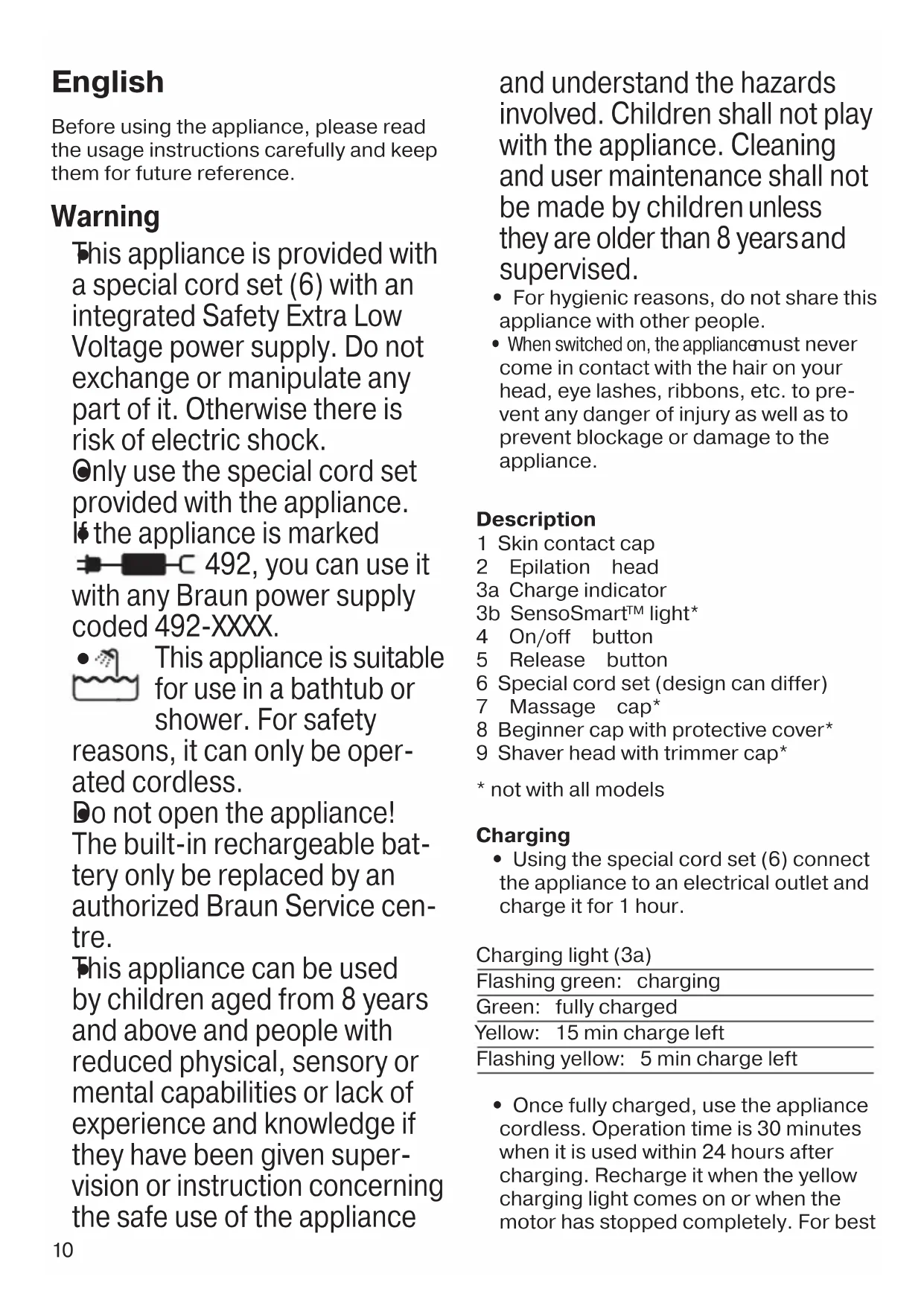 - When switched on, the appliance must never come in contact with the hair on your head, eye lashes, ribbons, etc. to pre- vent any danger of injury as well as to prevent blockage or damage to the appliance. Description 1 Skin contact cap 2 Epilation head 3a Charge indicator 3b SensoSmart